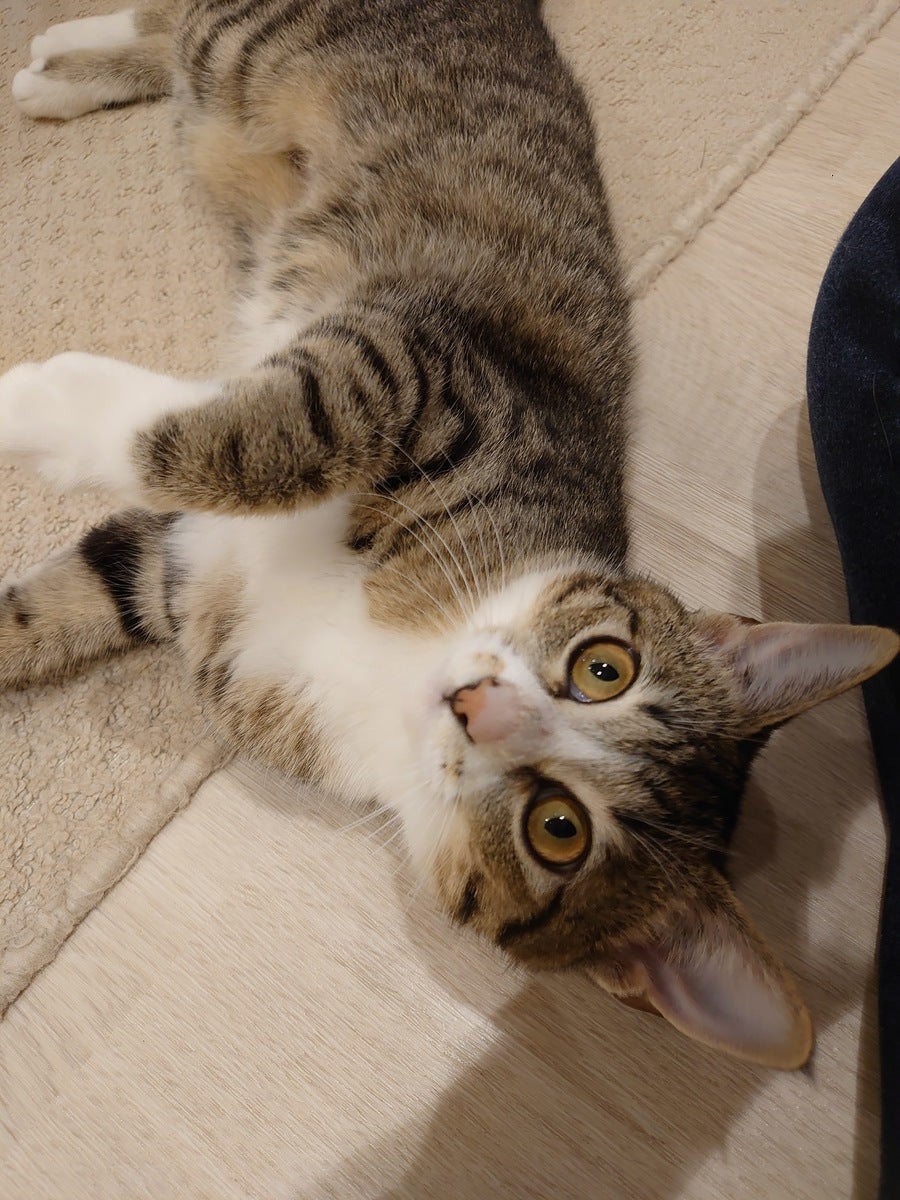 寂しがりやで人がいないと大きな声で鳴いて呼ぶんです。人の後ろをついて来る可愛い男の子。猫じゃらをくわえるとうなります。