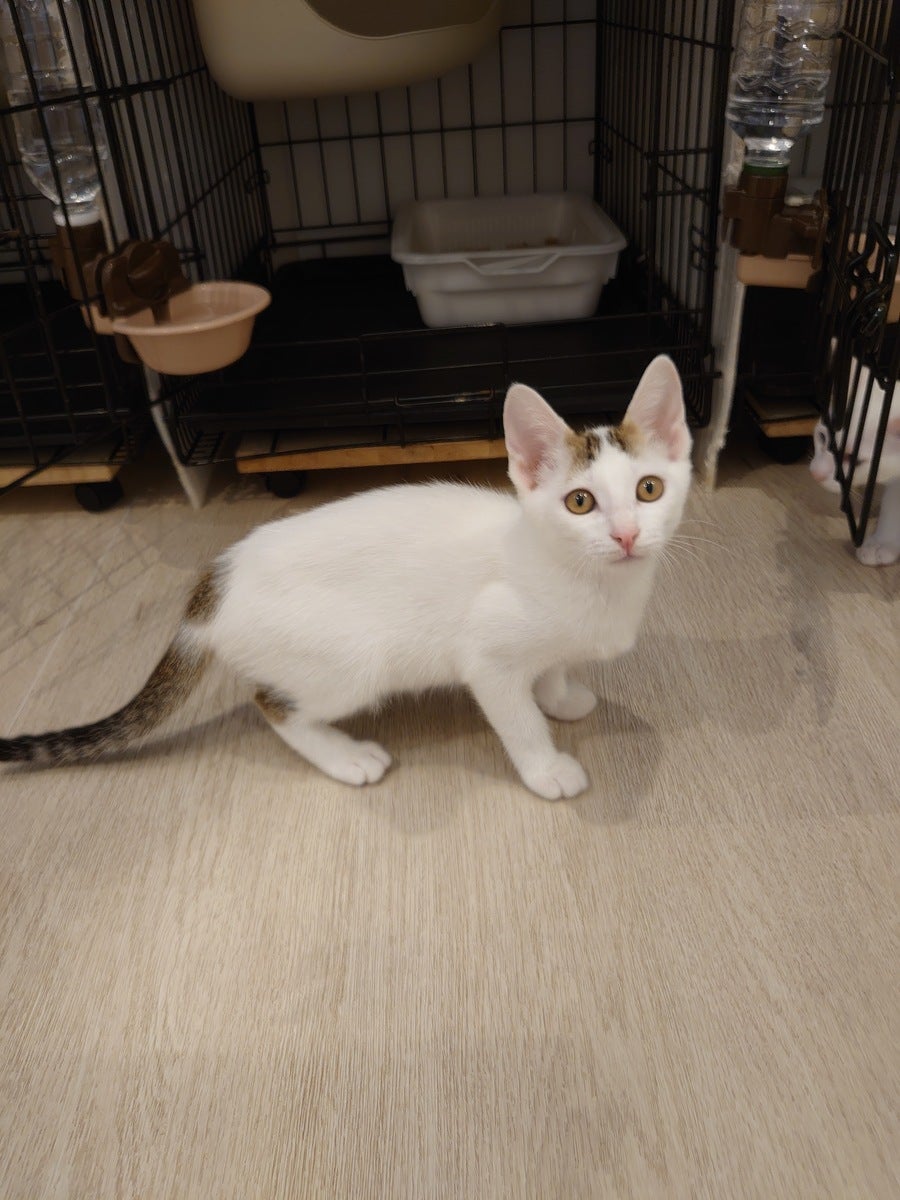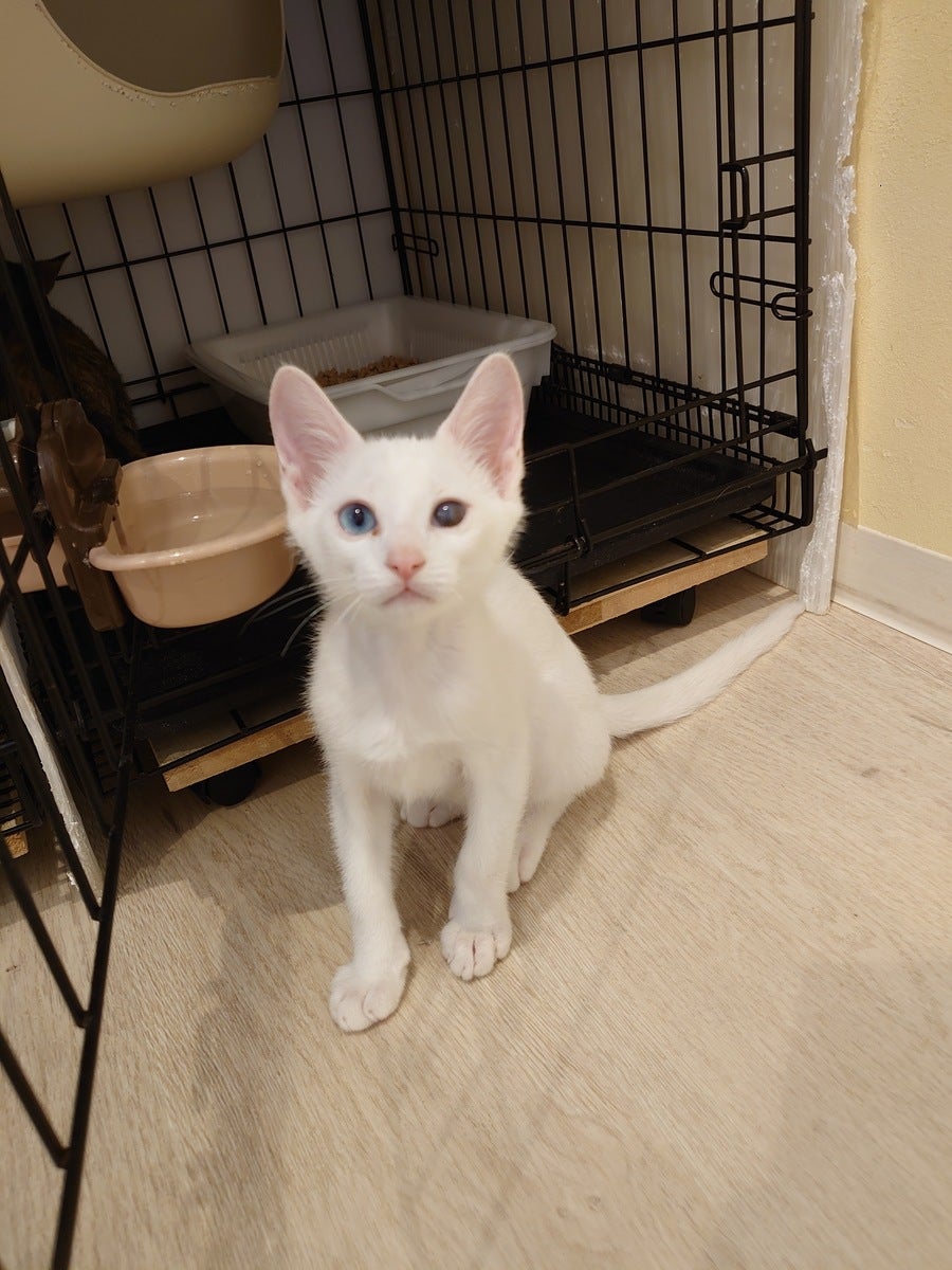白猫のおうりん君。3ヶ月の男の子。人馴れ抜群のスリゴロくんです。