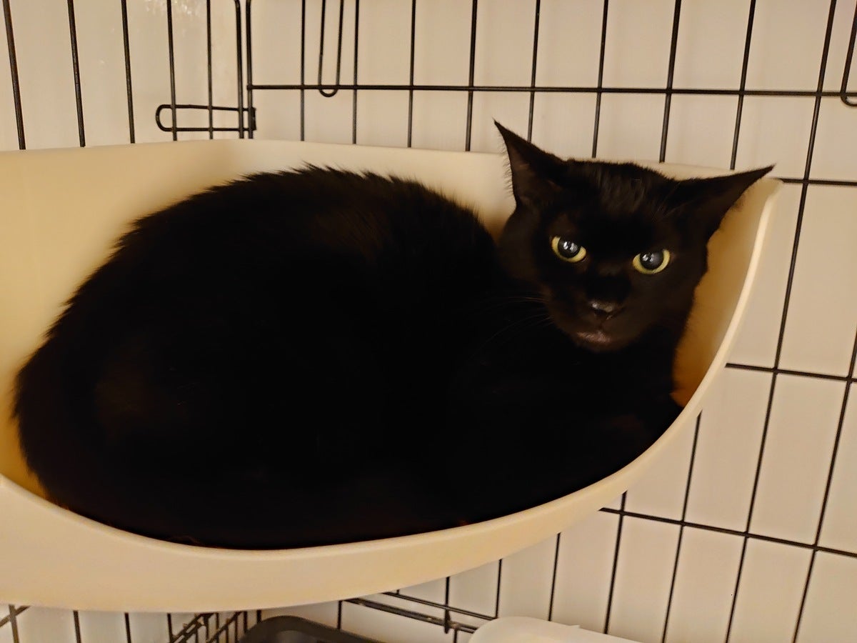黒猫のけいひちゃん。2歳の女の子。ビビりなのでまだ警戒していますが、慣れたら甘えん坊かと。
