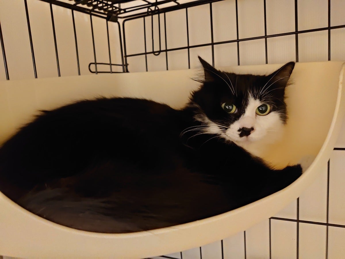 黒白 長毛のつくしちゃん。2歳の女の子。同じくビビりでまだ警戒しています。慣れれば甘えん坊かと。