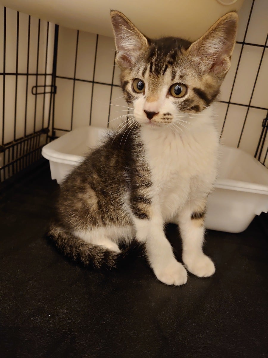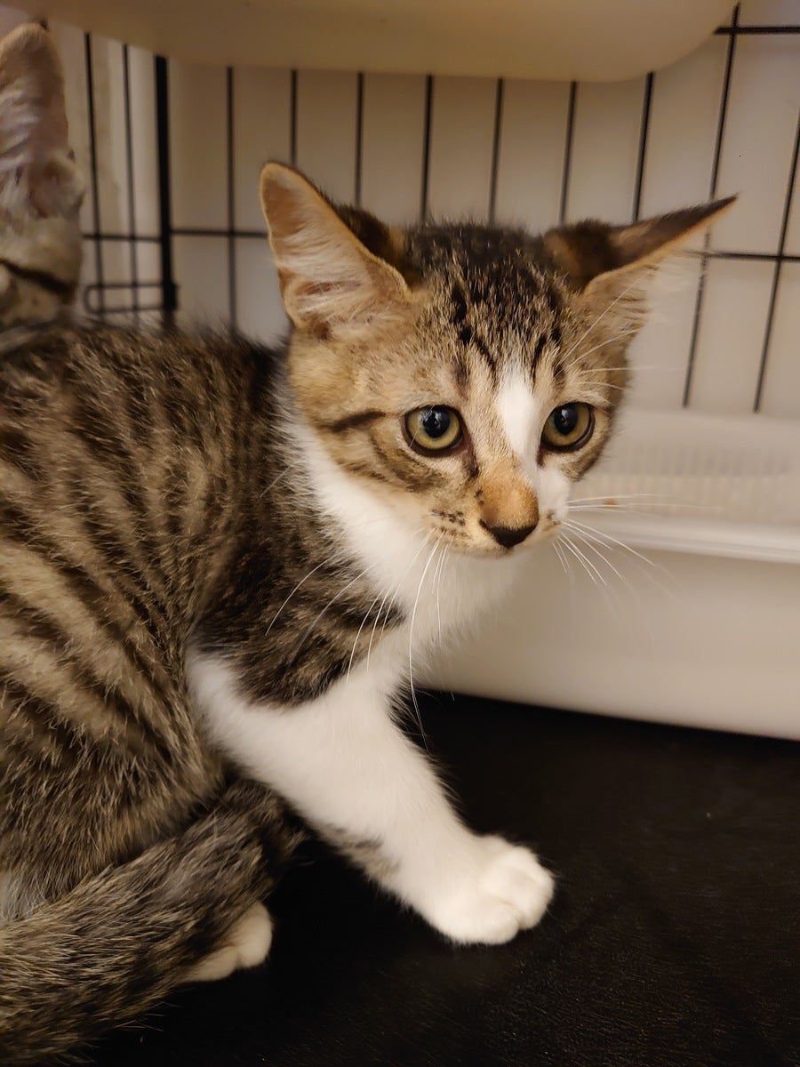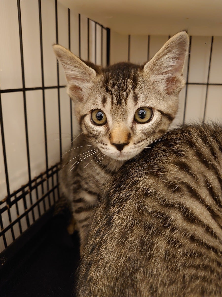 キジトラのテンちゃん。2ヶ月の女の子。好奇心旺盛で活発、元気なお転婆娘です。