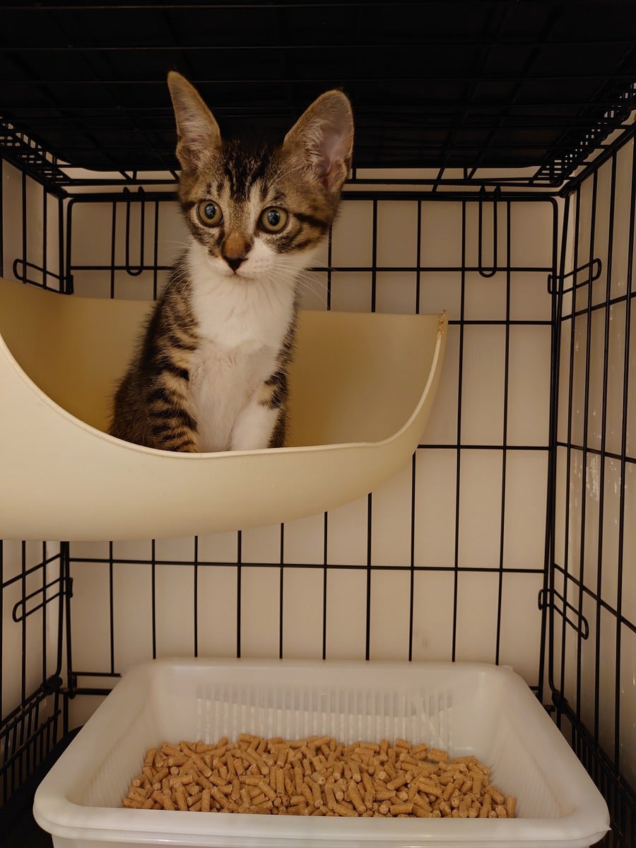 キジ白のメイちゃん。2ヶ月の女の子。活発で元気ですがマイペースな甘えん坊。