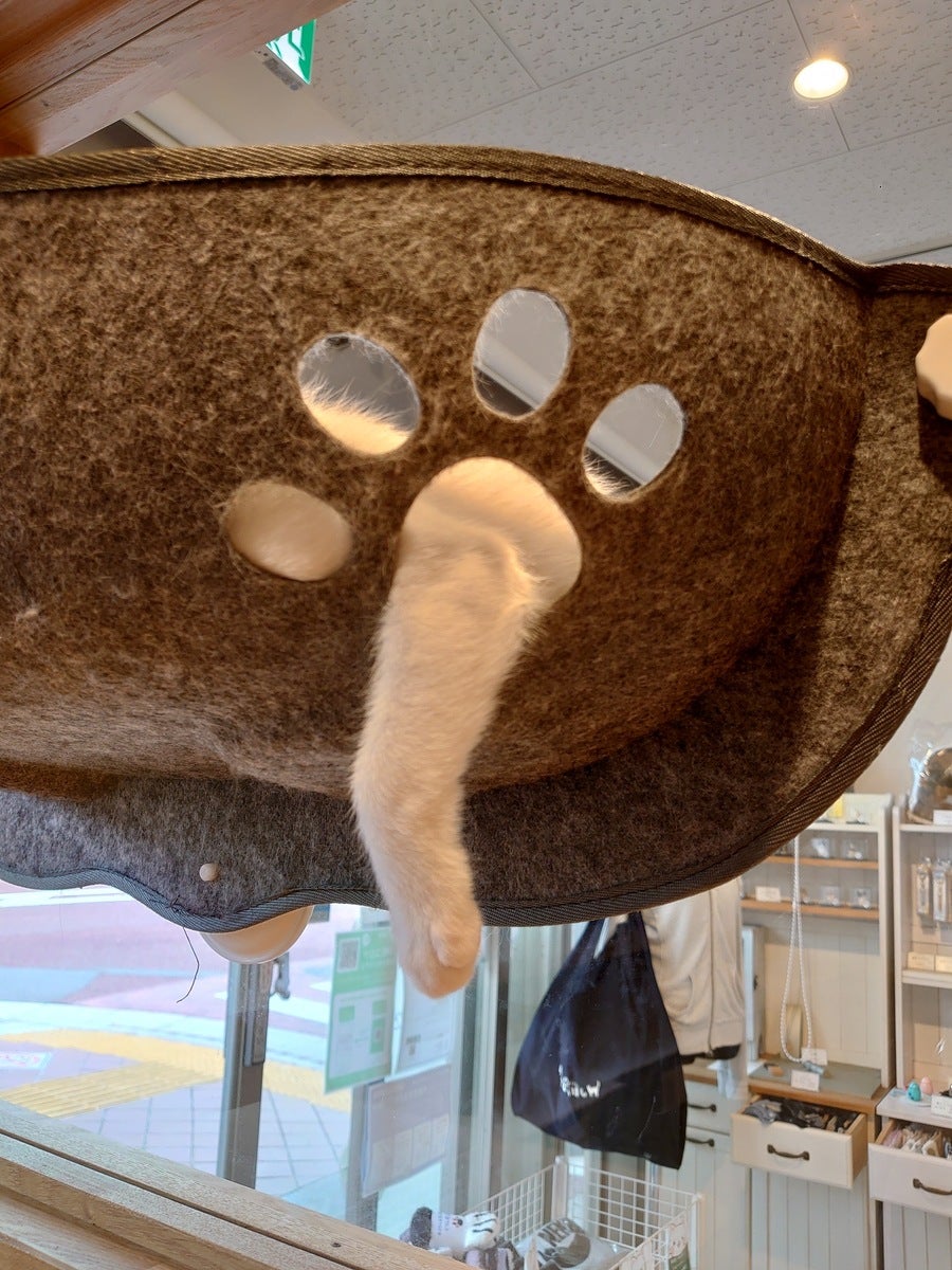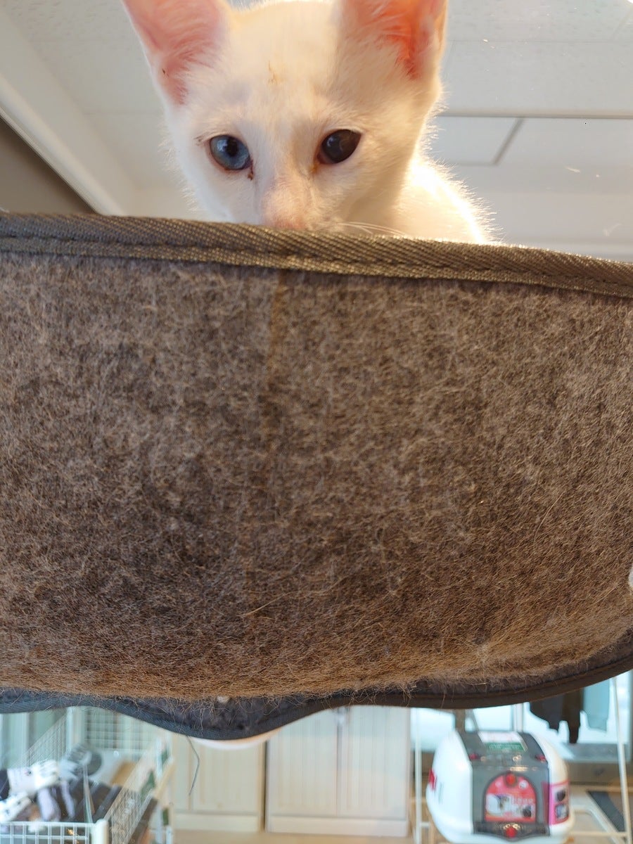 白猫のおうりん君。ハンモックがお気に入り!よくここで寝ています。ふと見ると肉球の穴からうまいこと手が出てる〜!