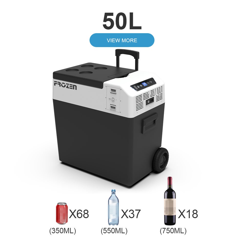 FCR-50L はBBQやキャンプの必須アイテムです。大型ホイール、ロングハンドル、カートリッジバッテリー、USB充電ポート、ソーラーパネル充電、アプリコントロール多くの機能を網羅した本格派最新ポータブル冷蔵冷凍庫です。容量は特大で50Lです。FCR-50L は機能性だけでなく、アウトドアで圧倒的な存在感を演出するデザインです