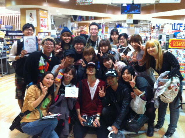 ELLEGARDENの細美さん(写真中央)にTシャツを手渡しした時の写真。僕は写真一番左。