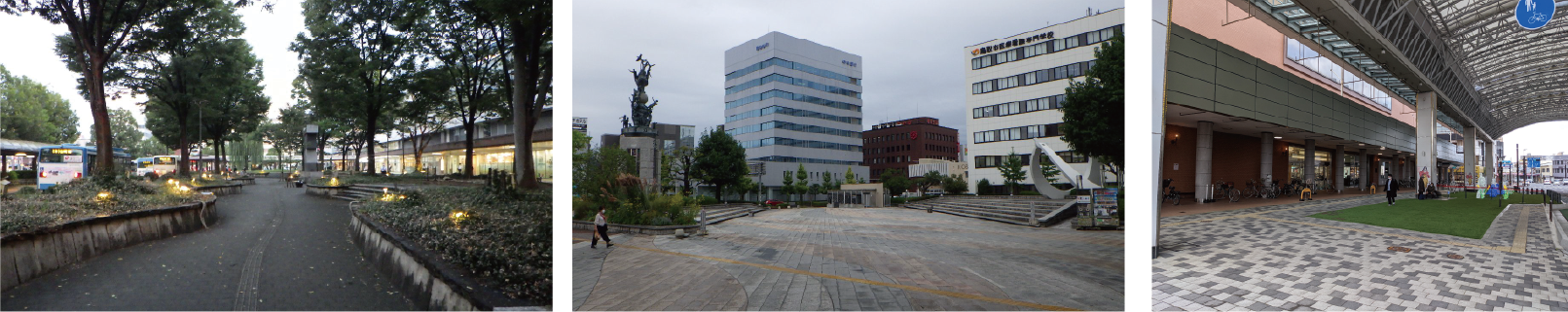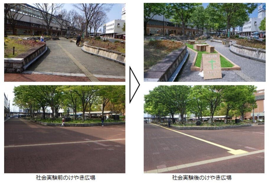▲社会実験エリアとなるけやき広場、風紋広場、バードハット