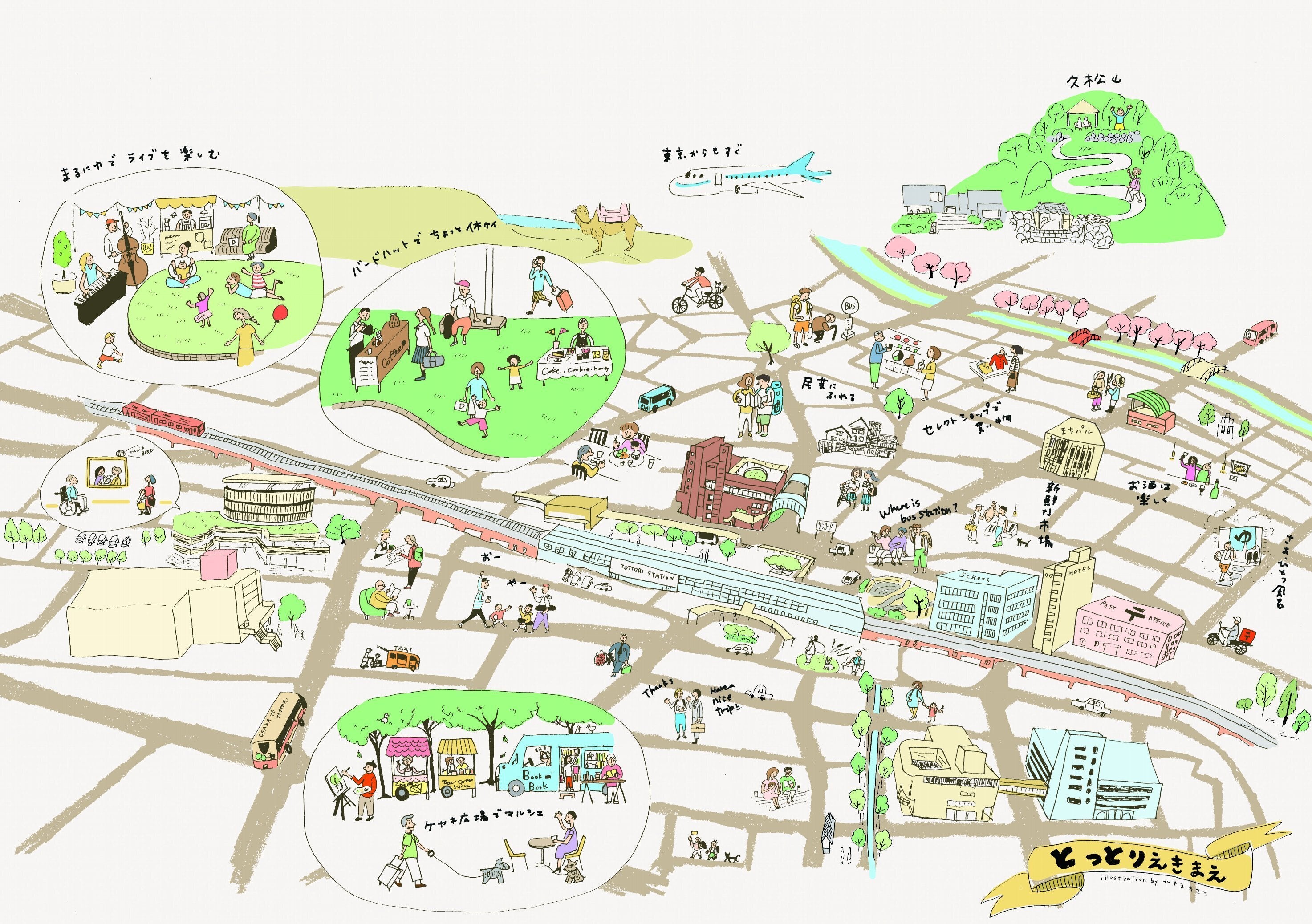 そのために、皆さんに親しみを持っていただけるような工夫を鳥取在住のイラストレーターにお願いしました。ひやまちさとさんにはとっとりえきまえ地図を、ハギワラスミレさんには鳥取WEDOエリアマネジメントと、まちやどりtottoriのロゴをデザインして頂きました。