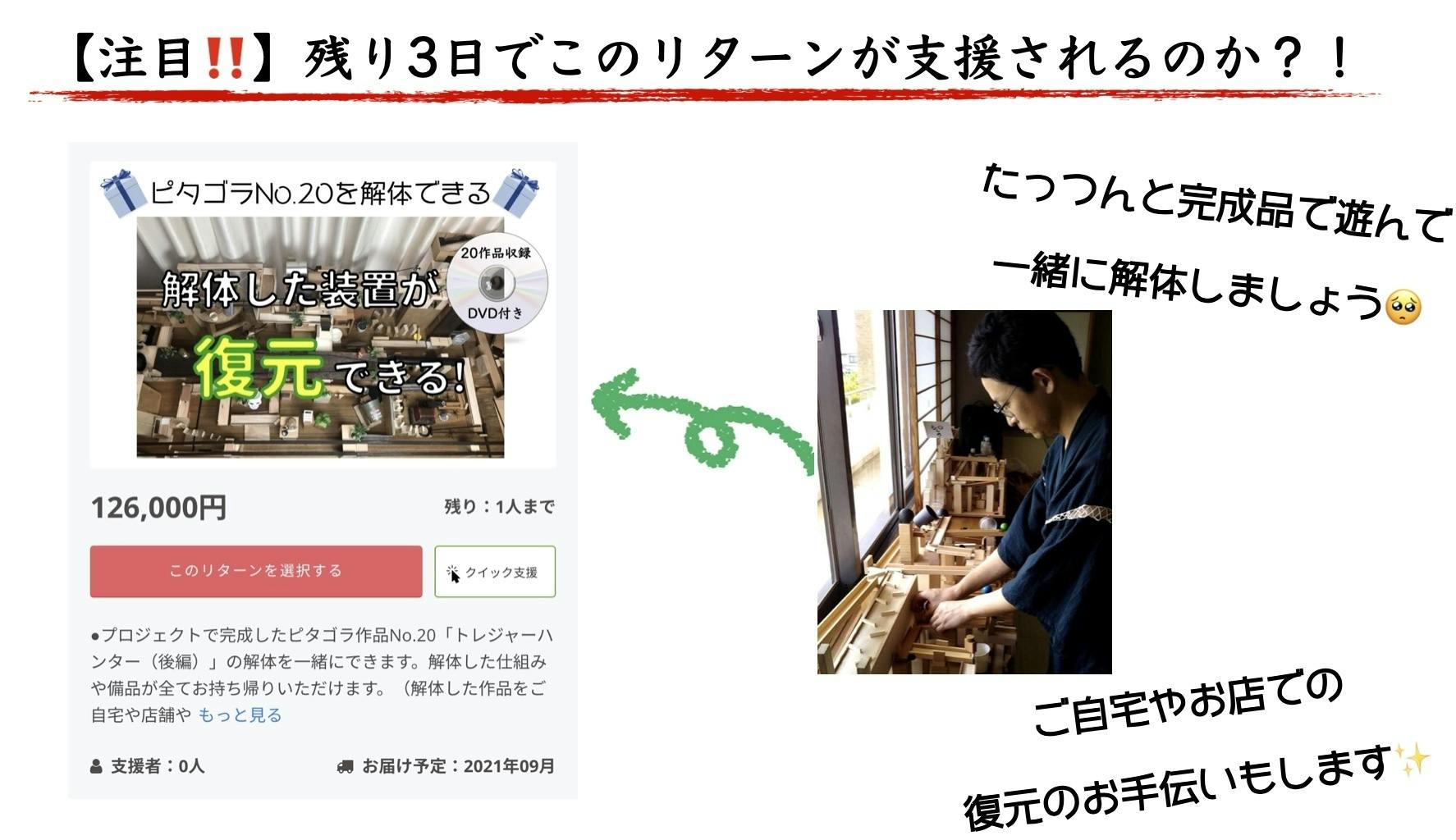 たっつんと一緒に完成品を解体&復元しよう!というリターンなのですが、完成品に使った備品を全てお持ち帰りいただける & ご自宅やお店などで復元ができる貴重な内容になってます。