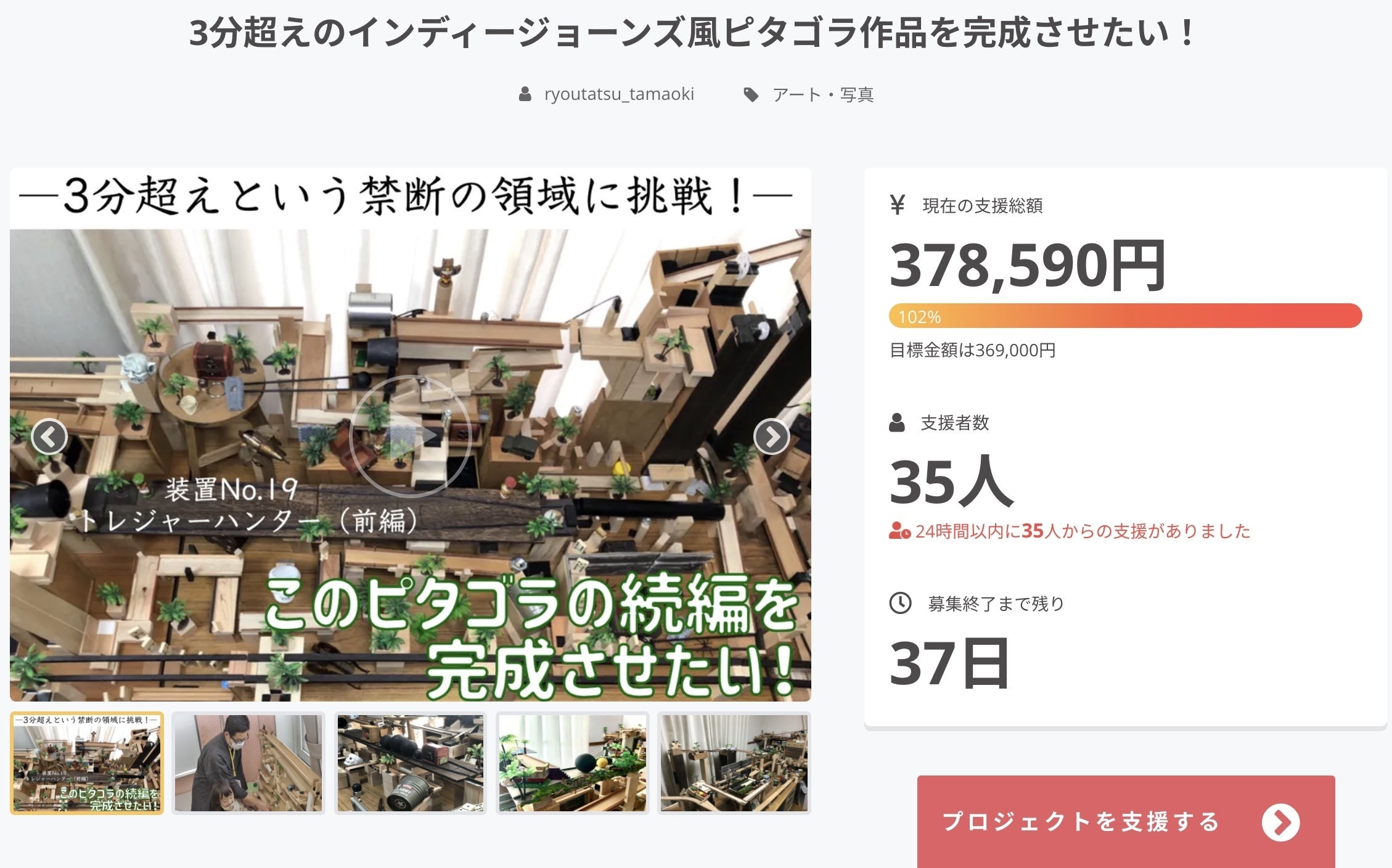 どうも、こんにちは!「3分超えのインディージョーンズ風ピタゴラ作品を完成させたい!」のプロジェクトオーナーの玉置です。この度はこのプロジェクトを応援いただきありがとうございます!おかげさまで、想像をはるかに上回るご支援をいただき、リターンの品切れが増えてきております。申し訳ございません。特に、「特製オリジナル制作キット3点セット」のリターンへの復活のご要望が多いため、少し金額は上がりますが、その分特製のギミック(仕組み)をおつけして、再度リターンとして復活させようと思います。生産数を限定していたのは、そんなに集まったら作れなくなるかもしれないという考えからでした。しかし、どうにか生産ルートが確保できそうであることから増枠も可能であると判断し、再度リターンとして復活させること決めました。前回の3点セットとはまた形は少し違いますが、ぜひご支援の形の1つとしてご検討くださいますと幸いです!それから!!なんと、オーダーメイド装置の企画も復活させます。形は少し変えての復活となる予定ですが、お楽しにしていてください。こちら、申し訳ございませんが、納期はもしかすると来年になるかもしれませんが、順次制作、発送を予定してます。お楽しみに!p.s.金額的な目標は達成しましたので、次は支援者数の目標を設定しました!次は100人の方にご支援されることを目標に活動を続けていきます!そして、目標金額100万円を当面の目標として見据えます。引き続きご支援お願いします。