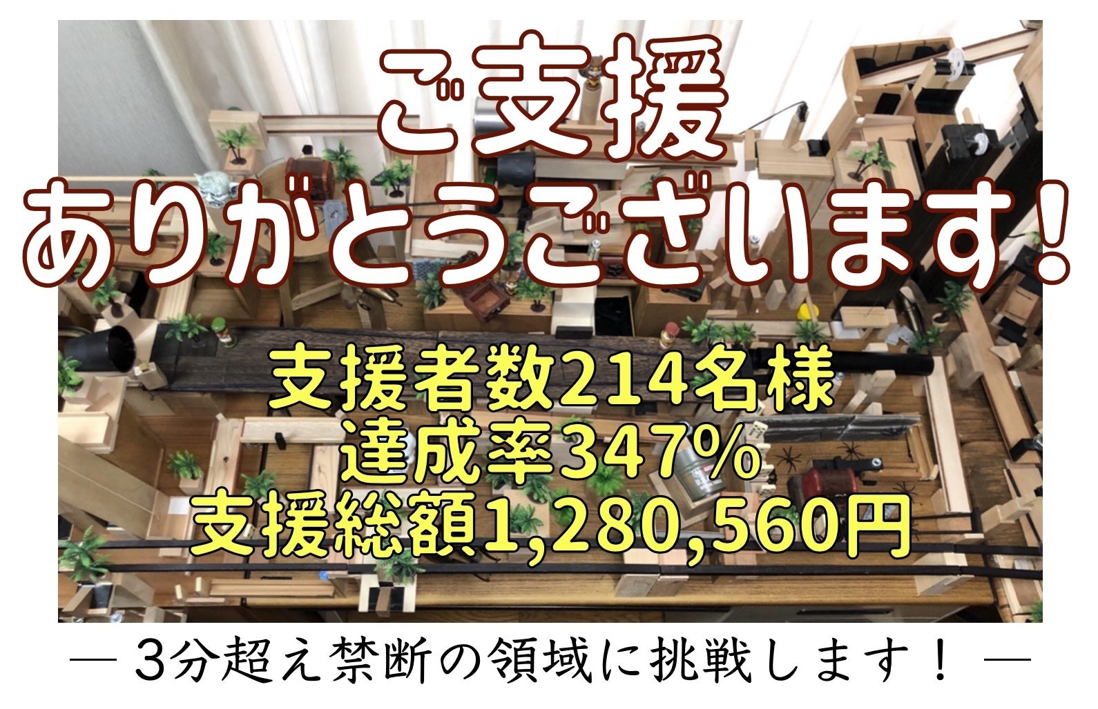 どうもご無沙汰してます。玉置です!先週のことになりますが、14日〜19日まで某ミュージシャンのリリックビデオ撮影のためのピタゴラ制作をしてきました。ほぼ缶詰で、毎日府中に出向き作業。想像以上にハードで、期限内に終わらせないといけないというプレッシャーから、今まで感じたことのないようなストレスを感じ、そのストレスの中で自分のパフォーマンスを最大限発揮するというなかなかなお仕事でした。そのおかげで、自分の持っていた可能性やスキルが開花し、ある意味で覚醒したような感覚すら感じることができました。このリリックビデオのリリースは来年になってしまうようですが、間違いなく自分史上最高の作品となりました。これは、ひとえに一緒に作業をしてくれた美術スタッフさん、そして監督のおかげです。一人ではけっして作り上げることは出来なかったと思います。そう、美術がすごかった。小学校から中学、高校までずっと平均の3評価(5段階中)だった自分にとっては、非常にエキサイティングな経験でした。美術によって彩られていく作品。この経験は、このクラウドファンディングで制作するピタゴラにも大きな影響を与えてくれそうです。ひらかれた自分の新たな感性を元に、ぼちぼち制作準備に取り掛かります。リターン品の返礼について6月30日にいよいよ調達させていただいた資金が入金されますので、リターンの材料や撮影機材の購入を進めていきます。そこで、かねてよりご要望のあった「リターン品を夏休みの自由研究に使いたい」というお声にお答えして、リターン用のキットの事前発送を検討しています。お子さんがいらっしゃる方限定で、夏休みが本格的に始まる8月前までに発送させていただこうと思います。ただ、この場合、完成品のDVDが別での発送となり、送料の負担が増えてしまうので、できればお子さんがいて、自由研究に使いたい方のみの対応とさせていただけたら嬉しいです。ということで、お子さんがいらっしゃる方で、自由研究に使いたいという方は、個人メッセージにてお声がけくださると幸いです。この件に関しては、またご連絡いたします。p.s.少しずつリターンの資材の調達や撮影機材の調達を進めています。リターンの返送に関しては、クラウドファンディングのページにもありますように、10月以降を予定しております。時間がかかってすみませんが、それまで活動報告などで状況をシェアしていきますので、楽しみに待っていて下さると嬉しいです!!これから、フルスロットルで制作進めていきますので少々お待ちください!!
