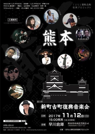 写真の「第2回熊本新町古町復興音楽会」のポスター/チラシは熊本市在住のデザイナーが制作したもので、熊本城のシルエットをバックに出演ミュージシャンの写真が「ク」の文字の様に並んでいます。実は熊本県の県章は、熊本の頭文字の「ク」の字を図案化し九州の地形を形どったものなのです。