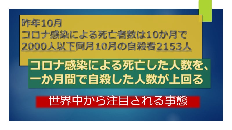 更に20歳以下は一年で44%増加し、小学生から高校生までは、1980年に統計と取り始めて以降初の25%増しでの自殺者数が過去10か月のコロナで死亡した人数を上まり、世界からも問題視されている。