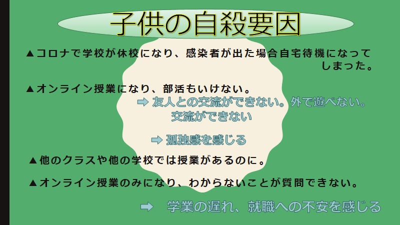 このままでは、どんどん自殺者が増え、コロナが落ち着いた時には若者がいなくなってしまう。