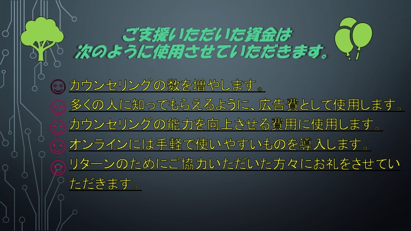 残された期間で私の思いが多くの支援者に伝わり、協力していただけることによって半年後には、カウンセリングの必要性を日本中にさせます。