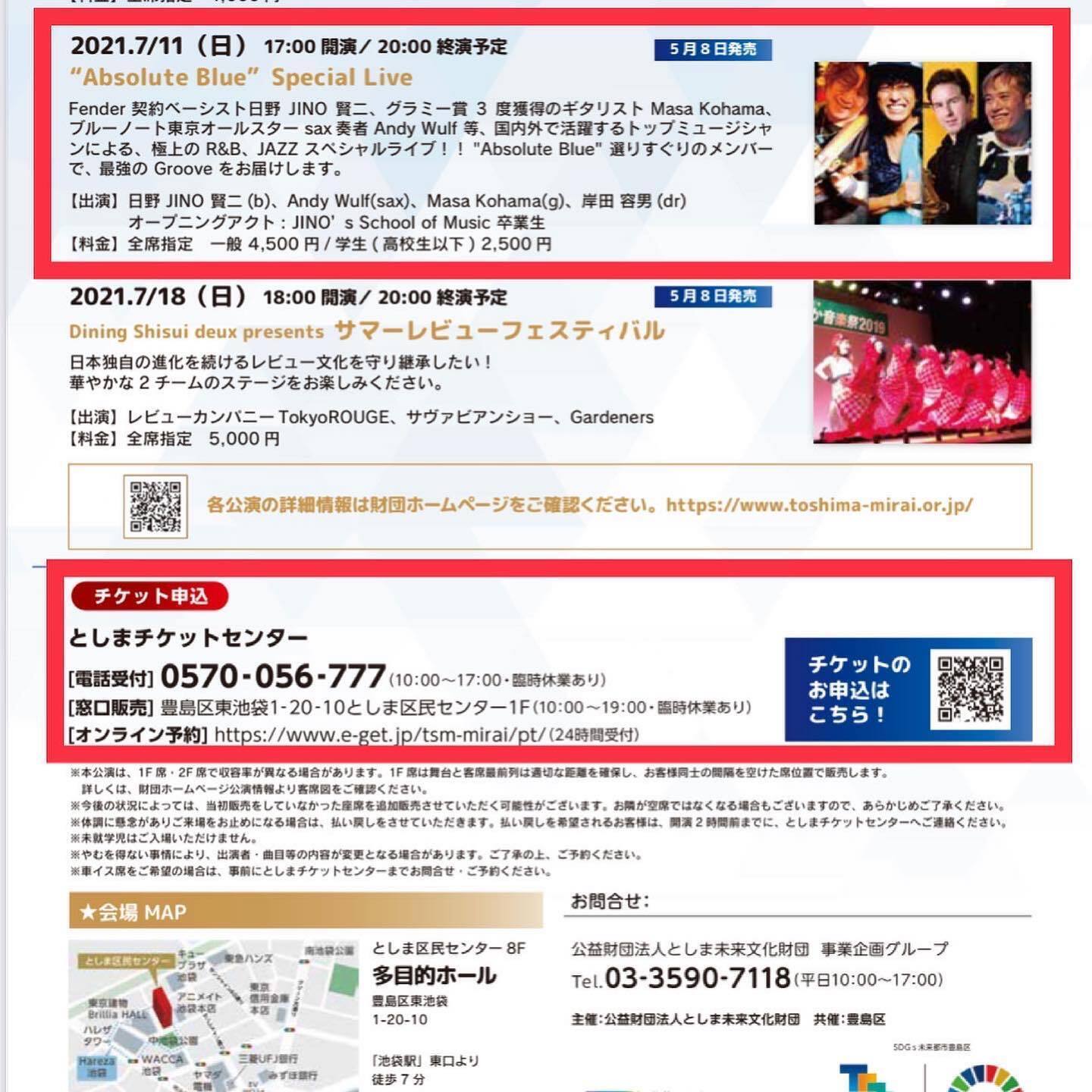 2021/05/14 14:385月8日にAbsolute Blue で開催し、大好評だった【クラウドファンディング100%達成感謝ライブ】のメンバーが、7月11日、豪華ホールでライブを開催!!全席指定、ご予約受付中です(^^)【詳細】https://www.toshima-mirai.or.jp/tabid216.html?pdid1=2460【ライブタイトル】LIVE MUSIC in HAREZA としま ライブハウス応援 プロジェクト【Absolute Blue Special Live】【概要】★Absolute Blue 企画、としま未来文化財団主催、豊島区共催のライブイベント。Fender 契約ベーシスト日野JINO賢二、グラミー賞3度獲得のギタリスト Masa Kohama、 ブルーノート東京オールスター sax奏者 Andy Wulf、ドリカムやAI等のステージに立つドラマー岸田容男。国内外で活躍するトップミュージシャンによる、極上の R&B、JAZZ スペシャルライブ!!"Absolute Blue"選りすぐりのメンバーで、 最強の Groove をお届けします。【日程】2021年7月11日(日曜) 17時00分開演(16時30分開場/20時00分終演予定)【会場】としま区民センター 8階多目的ホール【出演】日野 JINO 賢二(b) Andy Wulf(sax) Masa Kohama(g) 岸田 容男(dr) オープニングアクト: JINO’s School of Music 卒業生【チケット発売日】5月8日(土曜) 10時【料金】全席指定 一般 4,500円/ 高校生以下2,500円※未就学児入場不可※車イス席をご希望の場合は、事前にとしまチケットセンターまでお問合せ・ご予約ください。【チケット申込】[電話販売]としまチケットセンター0570-056-777(10時から17時) ※臨時休業あり[窓口販売] 10時から19時 ※臨時休業あり[インターネット販売] https://www.toshima-mirai.or.jp/tabid216.html?pdid1=2460★全席指定です。座席表など、詳細は下記URLのページをご覧下さい。https://www.toshima-mirai.or.jp/tabid216.html?pdid1=2460★Absolute Blue でのチケット販売は行っておりません。 もっと見る