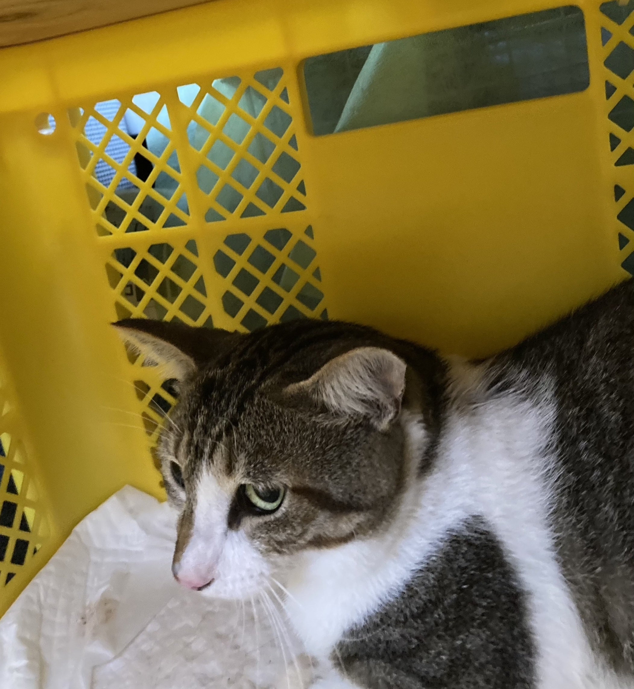 TNRを行いました。1ヶ月前から一人暮らしのお年寄りのお宅に通い始めた男の子です。捕まえるのが一番心配でしたが、その方に猫がよくなついていて、猫の体を触ることができたため抱き上げてもらって、洗濯ネットに入れ、お互い怪我をする事もなく、無事にキャリーに入れることができました。捕まえる時はびっくりして逃げようとはしたものの、車中でも病院でもとてもお利口さんでした。