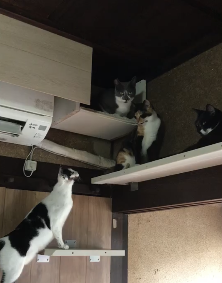 キャットウォークからエアコンへの飛び乗りを防止するため、小壁バリアを作りました。猫にとってパーソナルスペースはとっても大事!お気に入りスポットができた猫たち、ここに居る時間が増えました。うれしそうでなによりです♪(中村)