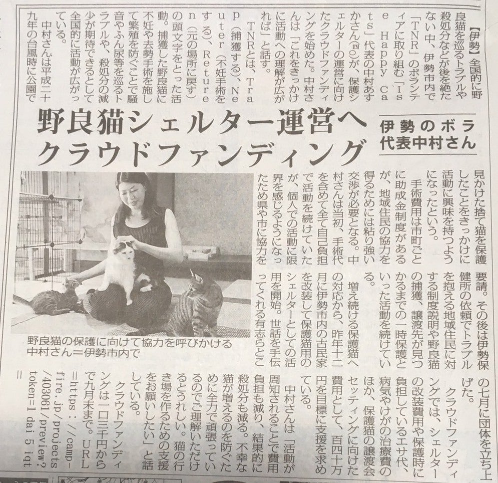今日8月21日の伊勢新聞に、このクラウドファンディングの記事が掲載されました。とても大きく取り上げて下さってありがとうございます。(江崎)