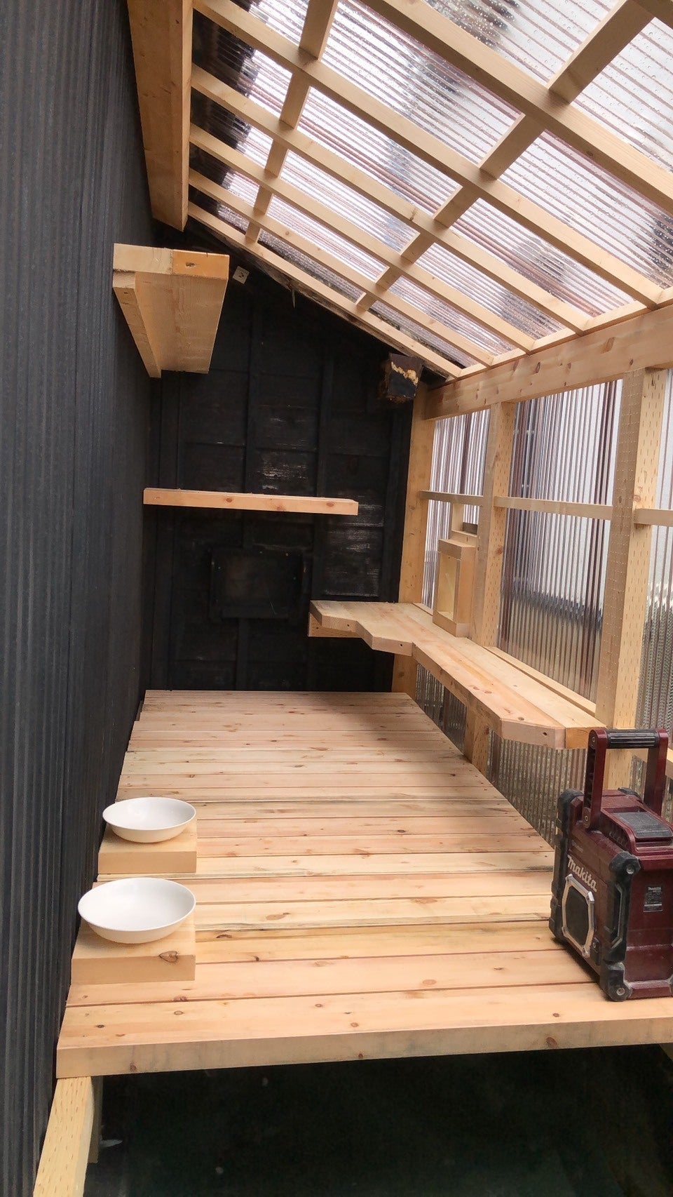 シェルター周辺で暮らしている地域猫(地域の理解と協力を得て管理されている、飼い主のいない避妊去勢済の猫)さん達の居場所が完成しました。これで台風の日も、雪の日も、お外で暮らしている地域猫さん達に、少しでも安心して過ごしてもらえることができます^^ (江崎)