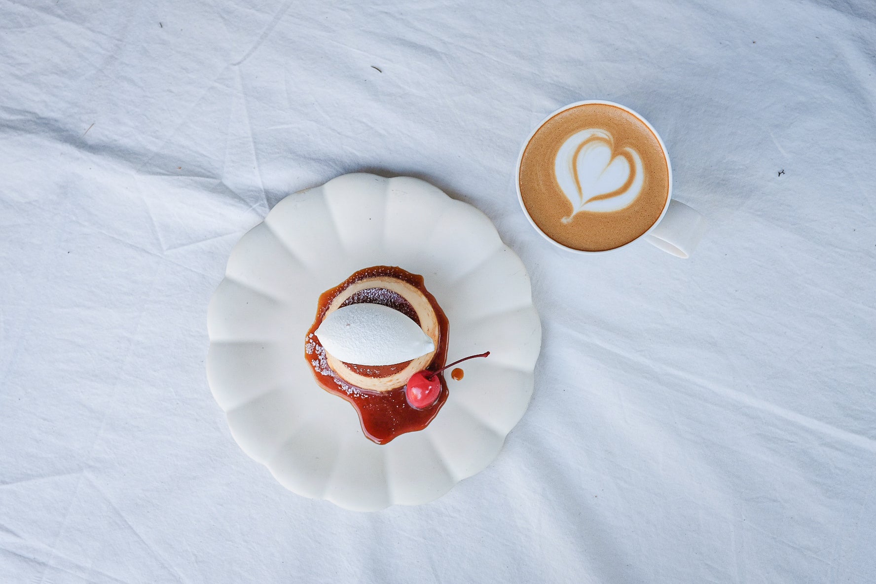 休みの日にお店でケーキとコーヒーを楽しむ風景。