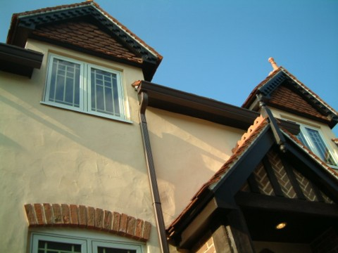 内外共にアーツ・アンド・クラフツスタイルの職人気質な雰囲気を大切にしたコテージです。手仕事の味わいを出した外壁に、本物の素焼き瓦を葺き、イギリス製オークの梁材やブリック、妻の装飾瓦でアクセントを付けています。玄関のゴシックアーチドアや階段材はオリジナルデザインにこだわり、リビングには木製パネリングを施しました。