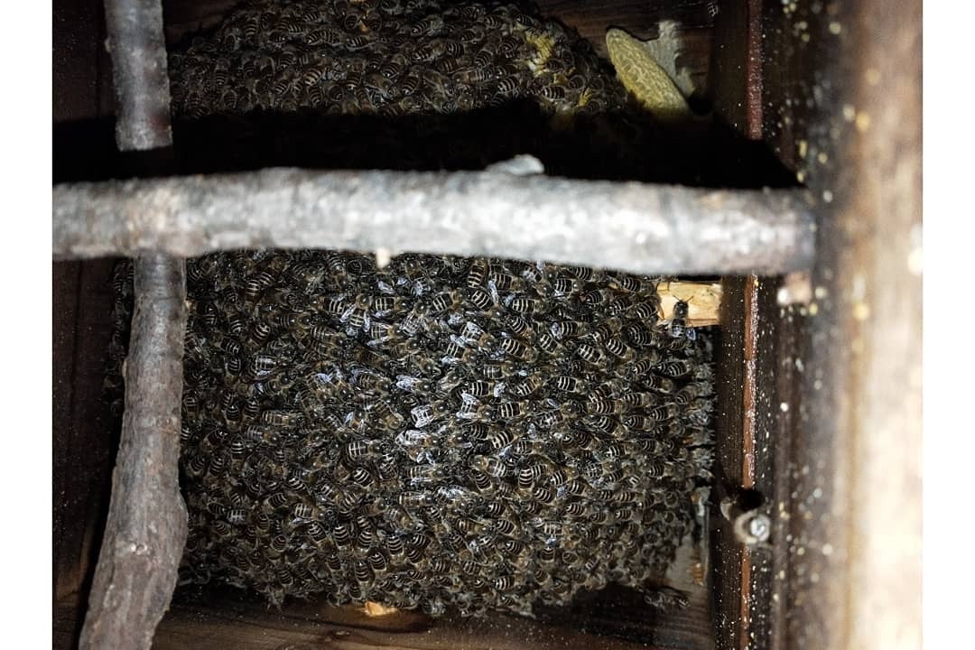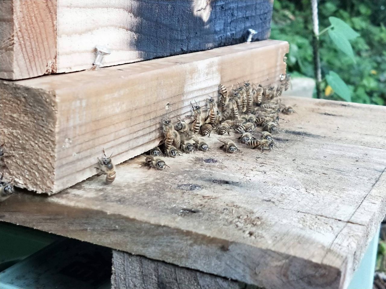 この沢山の蜂を見たら、恐怖を感じるかもしれませんが、お腹にタップリとハチミツを蓄えている蜜蜂はとても大人しく刺すことはありません。