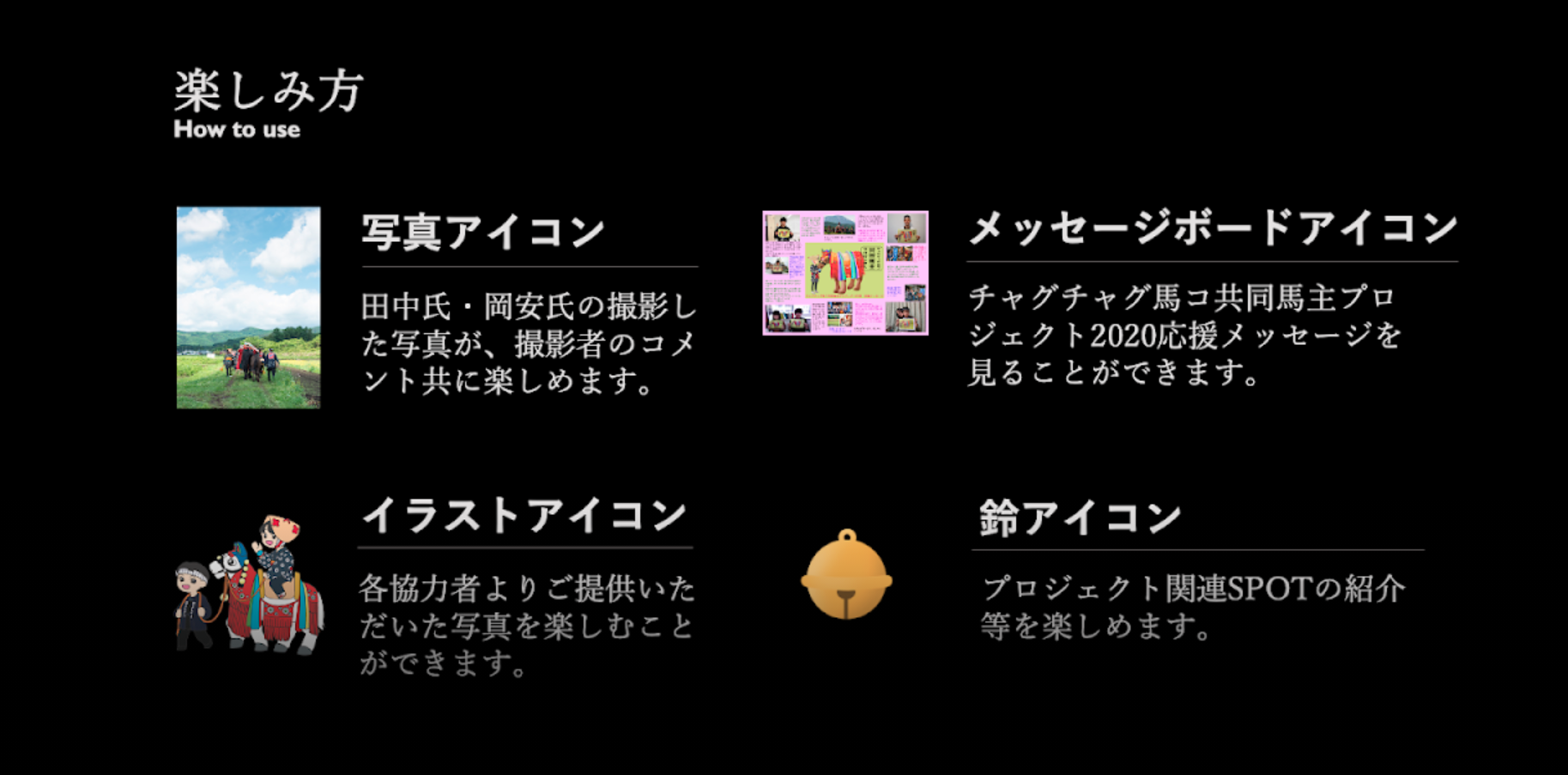 チャグチャグ馬コ共同馬主プロジェクトでは、集めさせていただいた支援金を、クラウドファンディング手数料、事務諸費用・運営にかかる費等と付随させて頂いた商品・サービスの代金を除いた金額を、僕らの支援している農耕馬を飼育している馬主さんへエサ代や管理費(敷料、削蹄代、医療費など)として頭数案分で分配しお渡しいたします。 また、チャグチャグ馬コの祭りの装束などの伝統馬事文化の継承活動へチャグチャグ馬コ同好会を通じて応援させていただきます。未来へのチャグチャグ馬コの祭りが継続する一助となってくれたらと僕らは思っております。