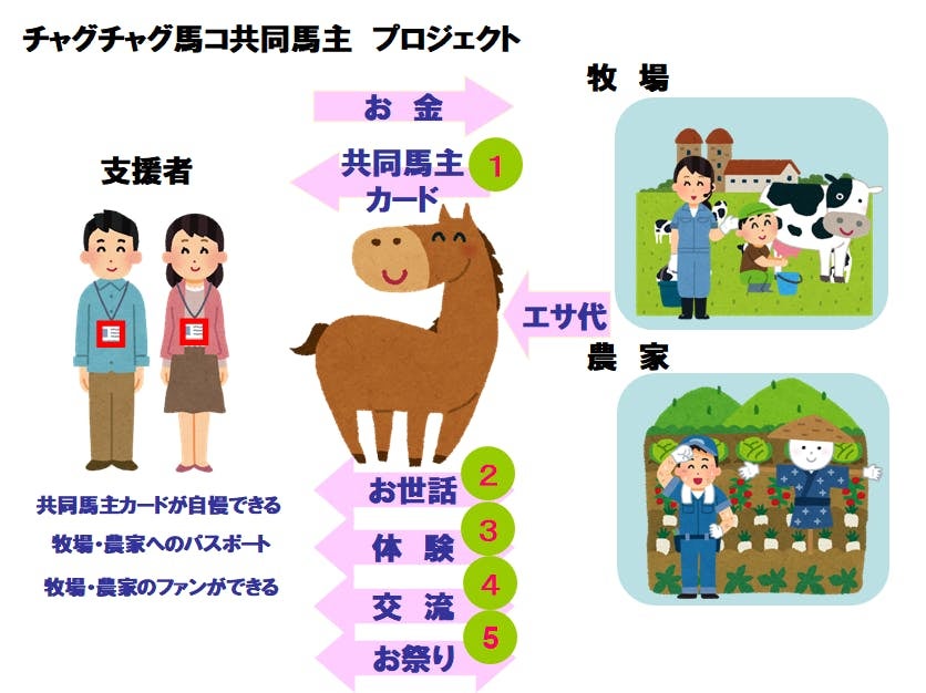 少しでもエサ代や飼育でたいへんな農家さんや牧場を支援し困っている馬が生まれないようにするため、また観光客が馬と触れられる環境が必要だとの思いより「チャグチャグ馬コ共同馬主プロジェクト」を考えました。