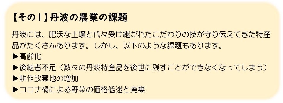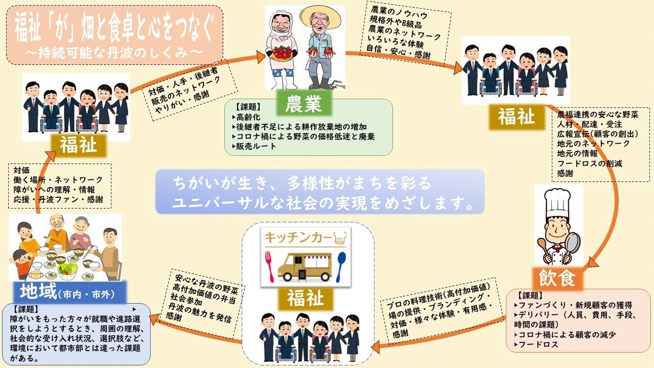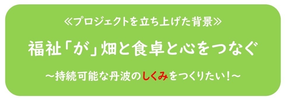 - ④高齢化・後継者不足・耕作放棄地など丹波の農業が抱える課題の解決の一助となれるよう連携していきます。 農業のプロとキャスト、料理のプロが一体となって、使われてない畑を復活させ、収穫、料理、販売、流通までを行うことで、課題の解決にむけ、農業を福祉「が」サポートする「持続可能な丹波」のしくみをつくります。