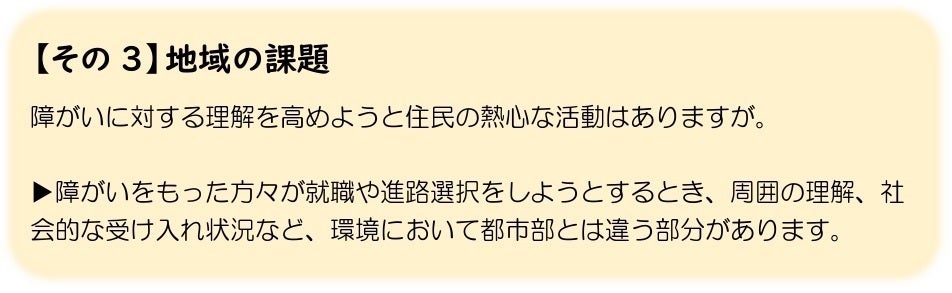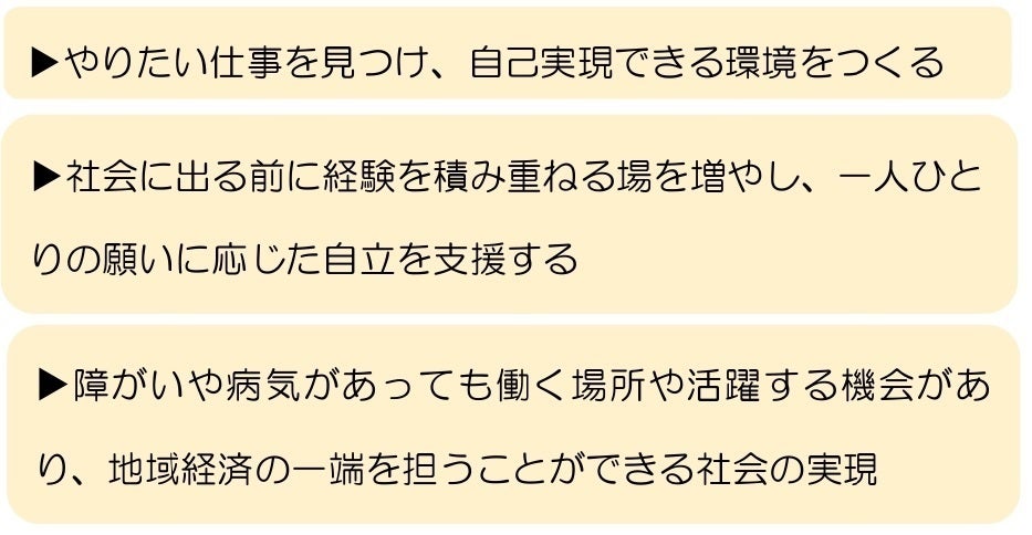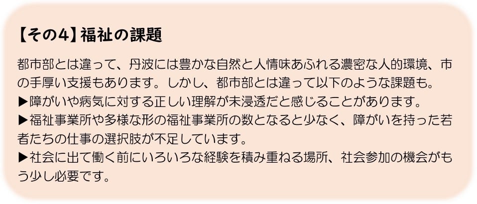 - ③活動を通して多くの方に会い、暮らしの中へ入って「ダイバーシティ&インクルージョン」の大切さをお手元までお届けし、丹波にユニバーサルの価値や豊かさ、幸せ感を拡げていきます。