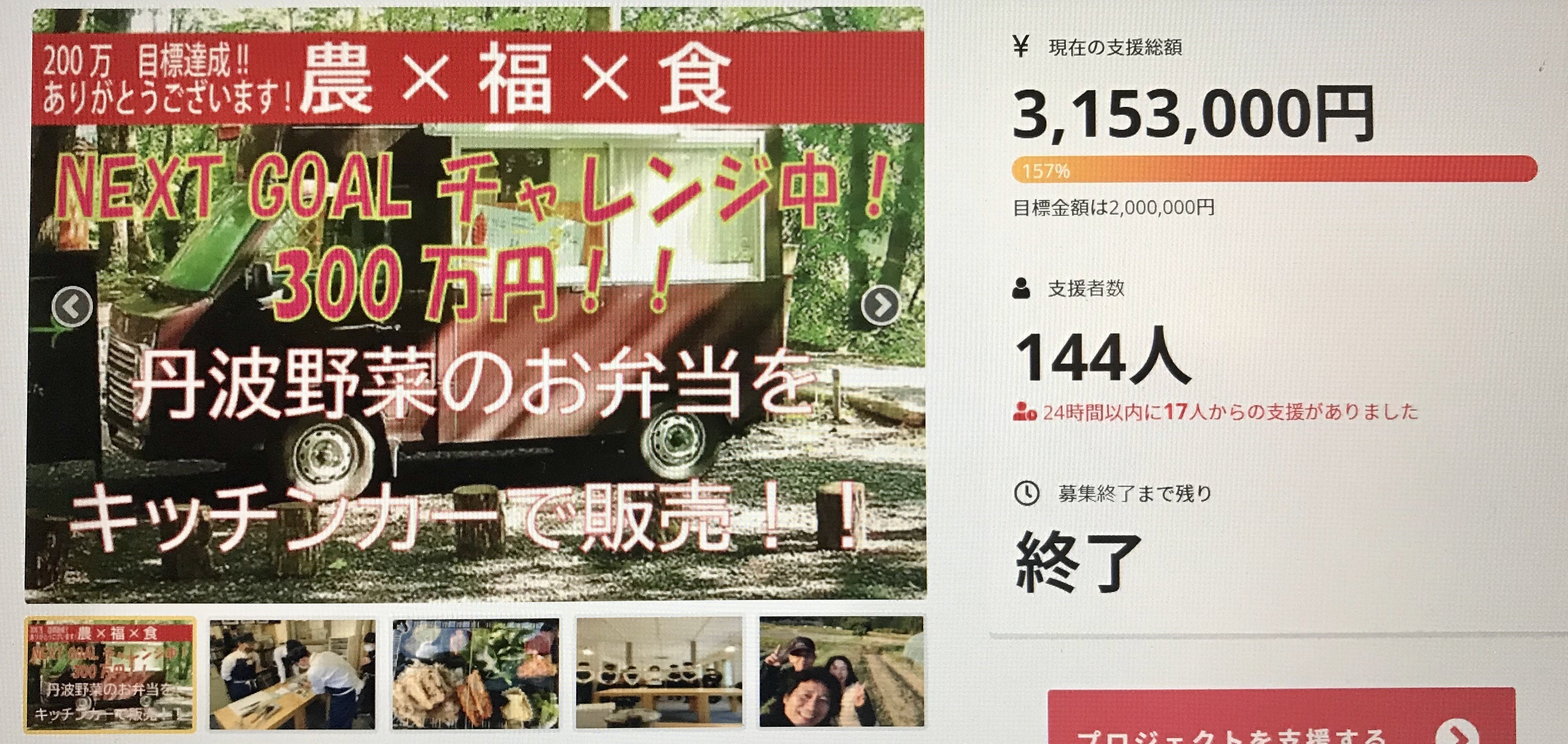 2021/07/01 00:34【ネクストゴール300万円達成してゴール!!】丹波キッチンカープロジェクトにご支援をいただき誠にありがとうございました。23時59分59秒を持ちまして3,153,000円というたくさんのご支援をいただき無事に終了することができました。本当にありがとうございました。これで終わりではなくスタートです。しっかりとみなさまのご期待に沿えるよう活動してまいりますので、このご縁を機に今以上のご支援やご教示を賜りますようよろしくお願いいたします。追伸:長期間にわたり、メールやSNSをお騒がせ致しましたこと、お許しくださいませ。ご協力ありがとうございました。丹波キッチンカープロジェクト一同 もっと見るあと40分です!!