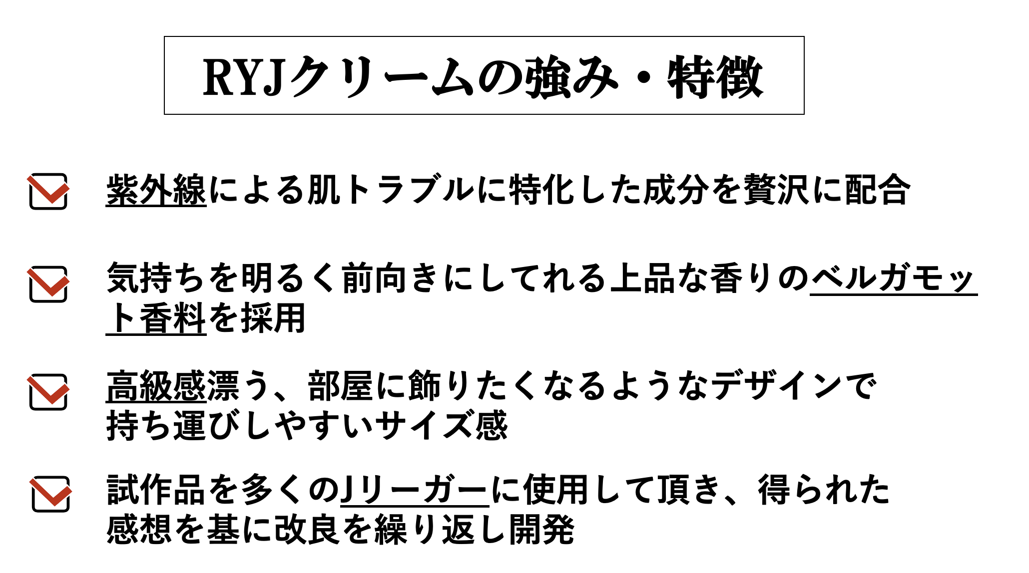 自身の肌悩みの経験を基に専門家と何度も話し合い、数名のJリーガーにサンプルを使って頂きアドバイスや要望などにもお応えし、必要な成分を探し求めました。