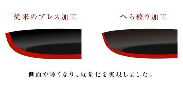 かつて計測したケースでは自社で試作した「20cm」のフライパンで、へら絞りを用いるとより「約2割」軽くなるという結果となりました。
