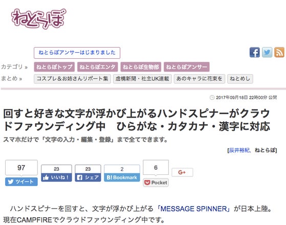 お陰でアクセス数がグーン!と伸びていて明らかに「ねとらぼ」さん効果。支援も200%を越えて順調に推移しています。執筆してくださったのは、辰井裕紀様。まだまだ無名の私達ですが、これを機に、しっかり魅力を伝えたいと思います。重ねて「ねとらぼ」様、辰井裕紀様、心より感謝しております。