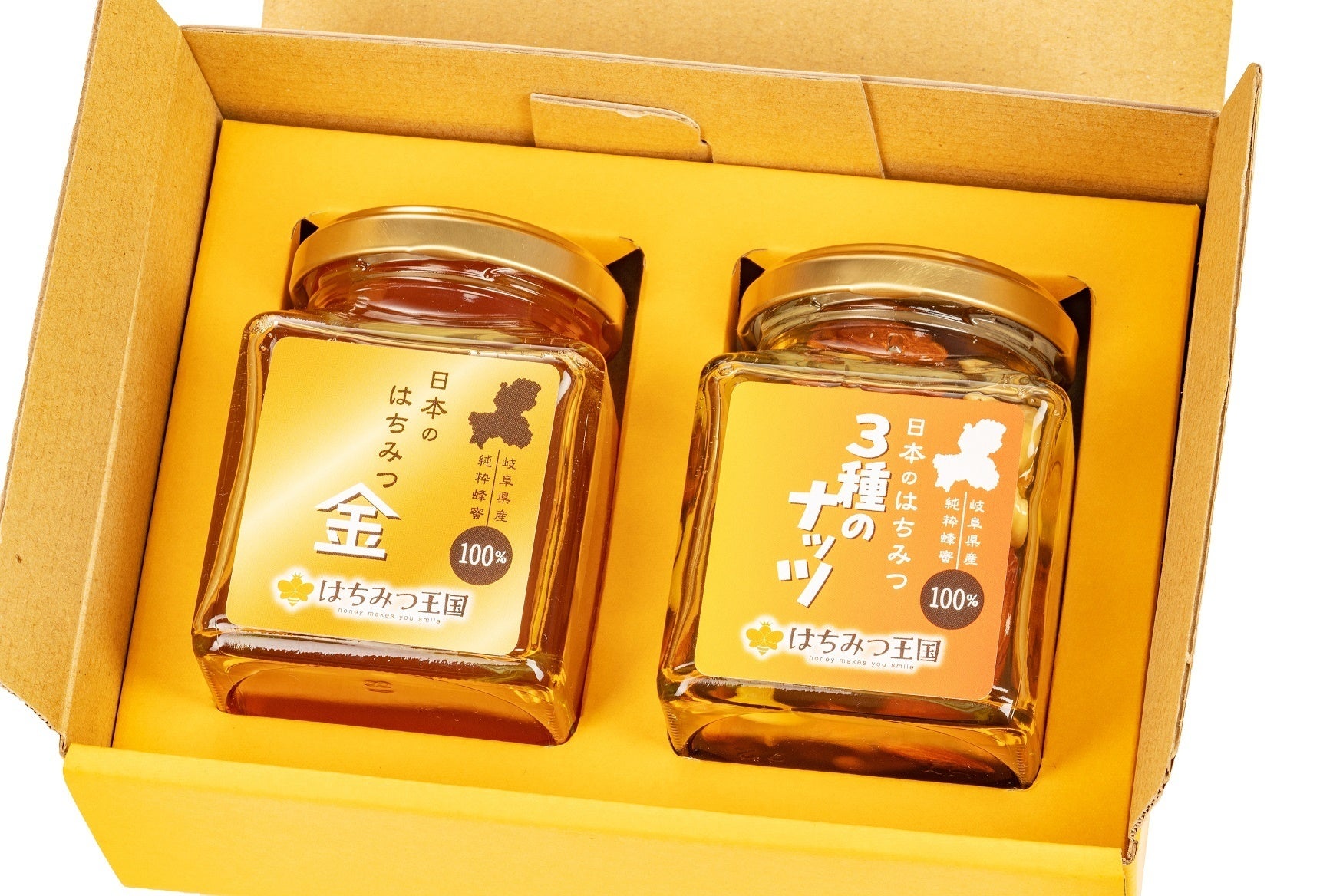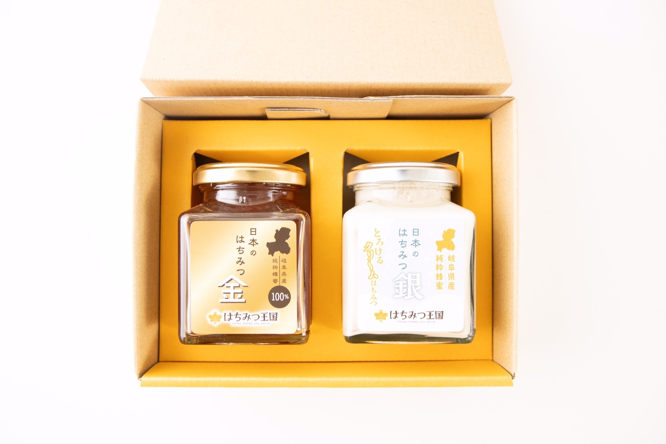 今回ご紹介させていただいた白いはちみつと、はちみつ王国自慢の岐阜県産生はちみつ「日本のはちみつ 金」を一つずつ、セットにしてお届けします! とろけるクリーム状のはちみつと、岐阜県産生はちみつの食べ比べをしていただくことによって、新しい驚きと発見が見つかります!