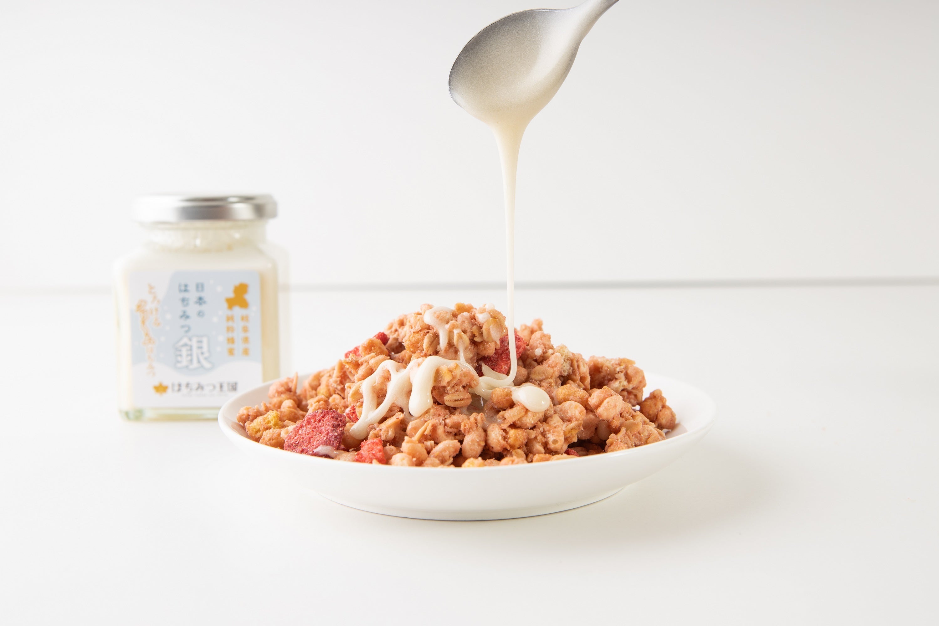 とろけるクリームが自慢の白いはちみつ「日本のはちみつ 銀」を、お手元にお届けします。たっぷり180g、じっくりとお楽しみください。お好みのグラノーラやパンに添えて、いつもの朝食が更に楽しみになりますね!白いはちみつを通して、岐阜県に興味を持ってくださるきっかけとなりますように!