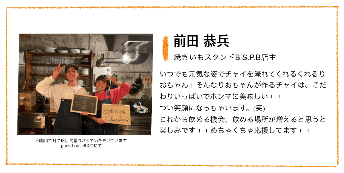 まずは、現在住んでいる大阪府の泉大津市にて、定期的にチャイを提供できる場所を探して、拠点地を作ってみたいです。大好きな珈琲屋さんを私のチャイカーに呼んでダーティーチャイ(珈琲×チャイ)でコラボしたり、アーティストの方にチャイカーの前で展示をしてもらったり...。