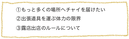 場所を問わず、ChaiTonaを必要としてくれているお客さまの所へチャイを届けるために、キッチンカーを手に入れたいです。