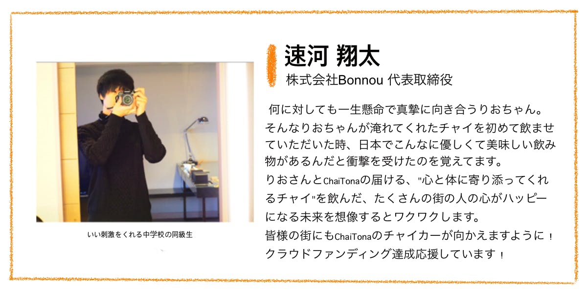 こうしてプロジェクトのページを作っていると、ChaiTonaをはじめて、まだたった1年ですが、私のチャイを飲んで『美味しい!』『癒される』と言ってくださったお客さま方の顔がたくさん頭に浮かび、幸せな気持ちでいっぱいになります。