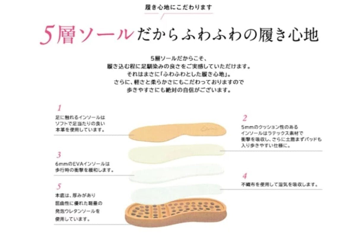 また、5層ソールでふわふわと柔らかくて軽いのが特徴。履き込むほどに足なじみが良く、歩きやすさを実感していただけます。