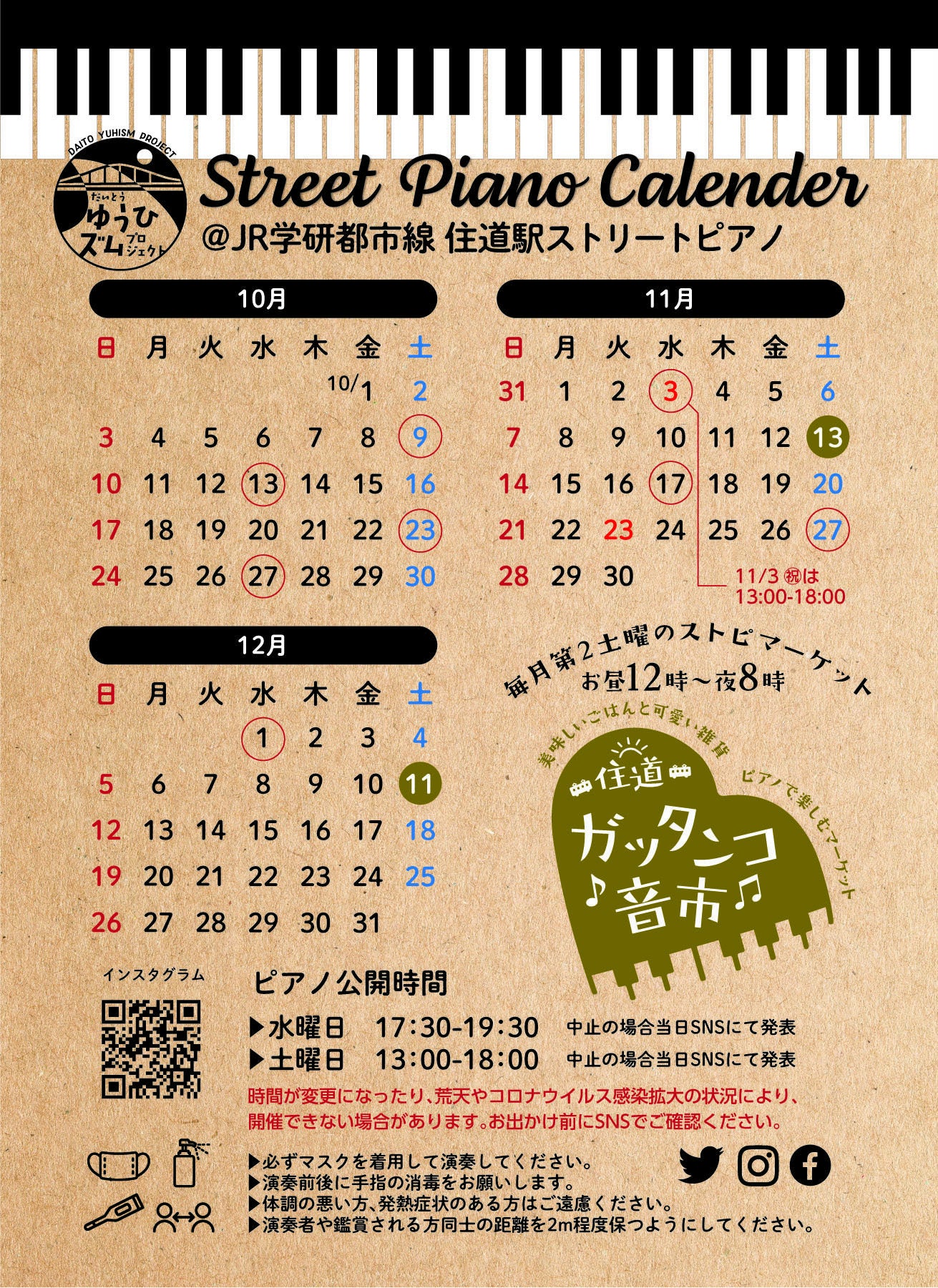 2021/10/31 18:46こんにちは。大東ゆうひズムプロジェクトです。久しぶりの活動報告です。9月末で緊急事態宣言が明け、JR住道駅ストリートピアノが再開して1ヶ月たちました。そして11/13(土)には念願のストピマーケット「ガッタンコ音市」を開催できることになりました。プロジェクトがやっと次の一歩を踏み出します!いろいろ制限がありますが、その中でもできることを。ピアノを聴きながら食べたり飲んだり楽しみませんか?ゆうひズムのブースではグッズ販売も行います。是非遊びに来てください! もっと見る