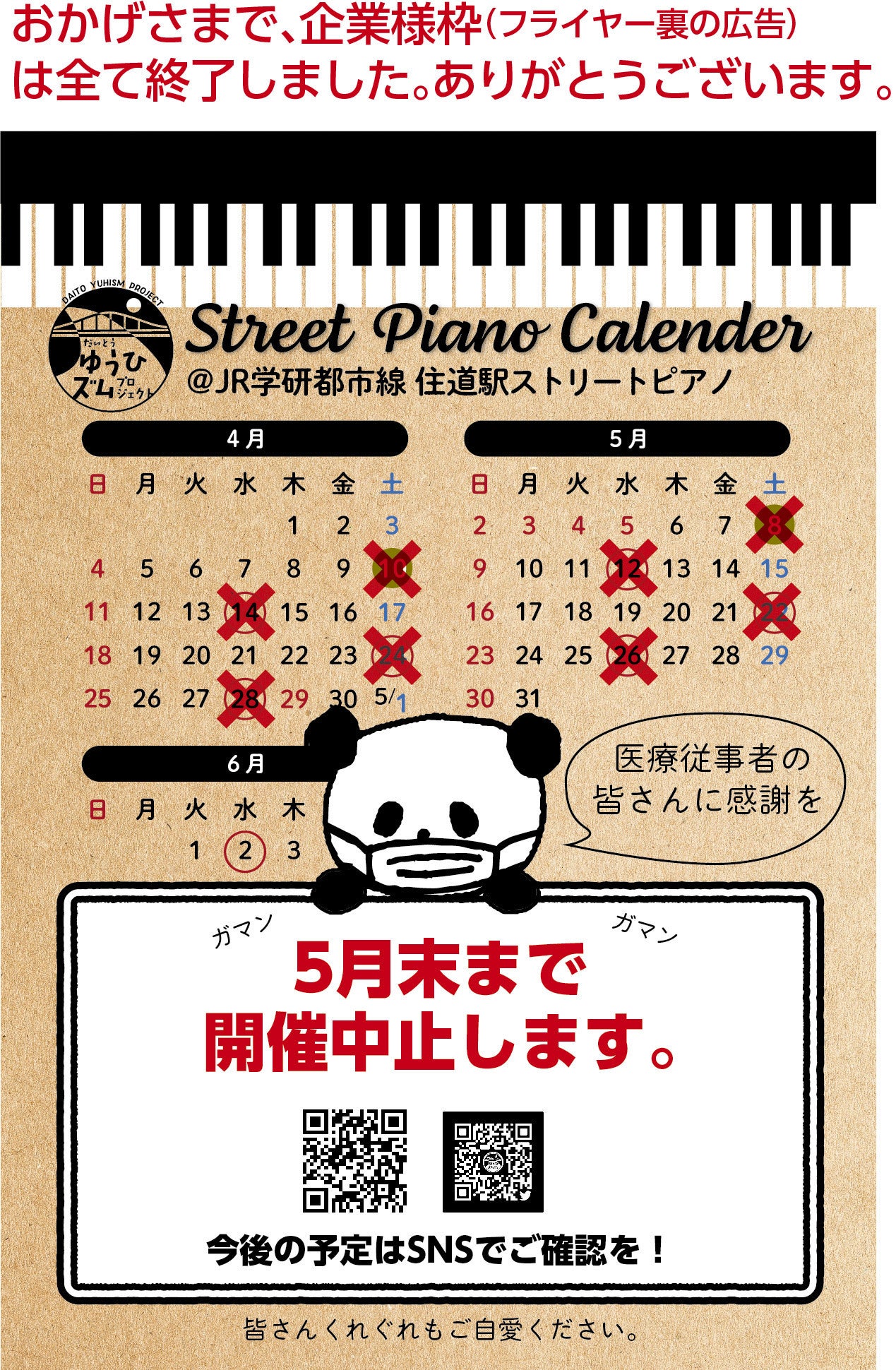 たくさんのご支援ありがとうございます。ネクストゴール100万円まであと少しとなりました。おかげさまで企業様用のピアノフライヤーの広告枠は予定していた枠に全てご支援いただけました。新たに企業枠でご支援を検討中の方がおられましたらご連絡いただけると幸いです。リクエストがございましたら、新たな企業枠をご提供できるよう企画したいと思います。daitoyuhism@gmail.comまでご連絡ください。またたくさんの方にオリジナルグッズのリターンに増額してご支援いただいております。本当にありがとうございます!緊急事態宣言が5月末まで延長されました。JR住道駅ストリートピアノの公開も5月末まで中止となりました。非常に残念ですが、我慢の時です。皆様にお会いできる日を楽しみに辛抱したいと思います。皆様、今一度手洗い消毒、きちんとチェックして、くれぐれもご自愛ください。