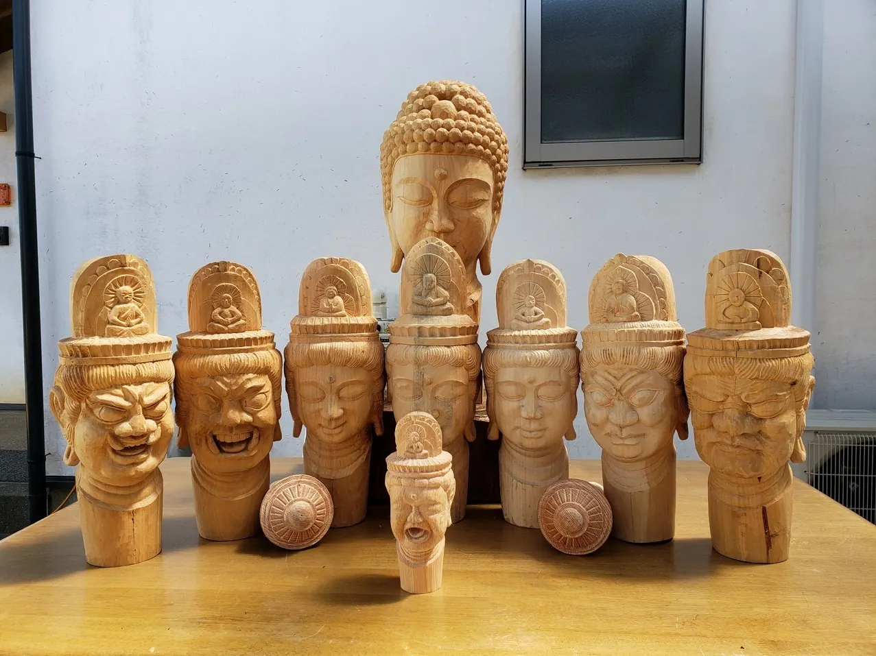 本日、それらのお顔が揃いましたので、記念に撮影いたしました(写真のもの以外のお顔は本体から直接削り出しています。下の写真参照)。