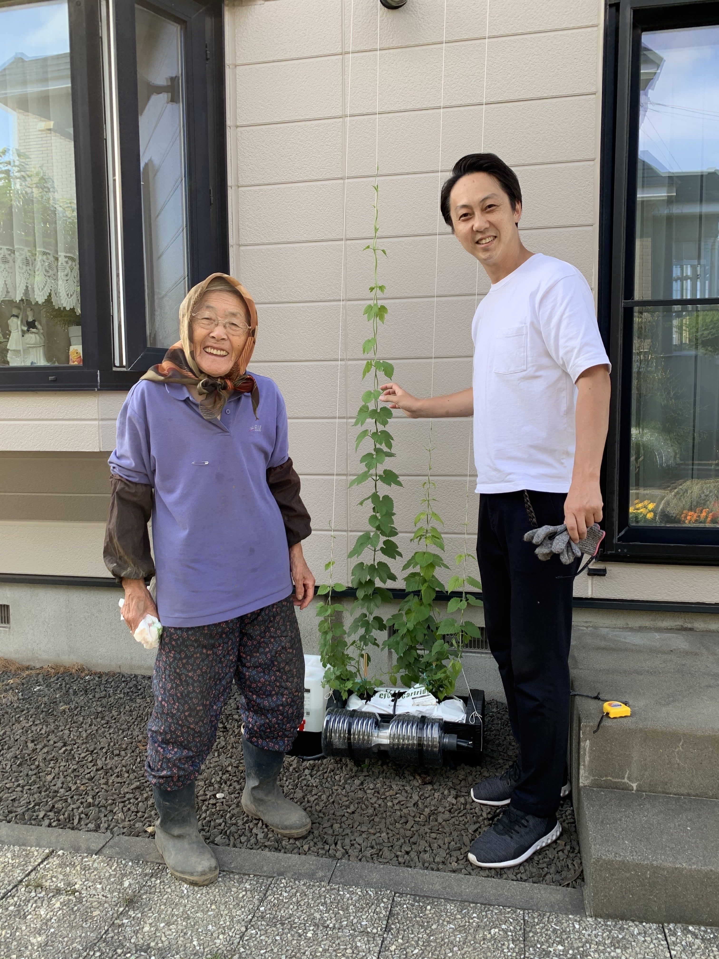 大湊と祖母と順調に育つホップ(撮影用にマスク外してます)