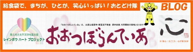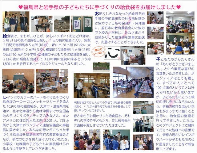 2011年(平成23年)3月の東日本大震災のとき、大津市ボランティア連絡協議会では、レインボーハートプロジェクト立上げ、レンボウカラーのハートを付けた手づくり給食袋の一つ一つにメッセージカードを添えた10,970枚の給食袋が、大津市・滋賀県内を始め、北は北海道から南は沖縄までの全国各地の手づくりボランティアのみなさん、またアメリカに住む邦人など約2,000人、728ヵ所から大津市に届き、それぞれの人たちの温かい想いがこもった給食袋を『給食袋で、まちが、ひとが、笑心いっぱい!おとどけ隊 』として、一杯に詰め込んだワゴン車で滋賀を出発して6月初旬に、被災した福島県の大熊町2校・1園、楢葉町1校・1園 、南相馬市16校、郡山市61校の新学期を向かえている小学校・幼稚園の子どもたち、または校長先生に2日間かけて直接に手渡しをいたしました。
