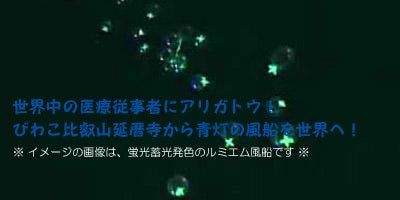 NWWAアリガトウプロジェクトでは、『ルミナスナイトバルーンで、まちが、夜空が、エココロ(笑心)いっぱい de アリガトウ!』をコンセプトに、世界の平和と人々の安寧も祈念して、びわこ比叡山延暦寺から幻想的なブルーの蓄光を発するルミナスナイトバルーン(青灯のルミエム風船)に祈りを込め夜空に舞い上がることで、世界中の医療従事者の人たちに感謝とエールが届くと願っております。