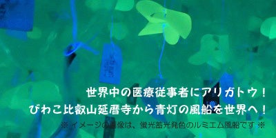 ひとりひとりの置かれている状況は違いますが、今回はプロボノ活動の一環として、NWWAアリガトウプロジェクトは、MAKE IT BLUE JAPAN実行委員会さんの活動に賛同し、協力を賜る比叡山延暦寺さんの忘己利他の教えと、これまでの活動で培ってきたものに、マテリアル風船・遊さんの協力による特別仕様のブルー蓄光発色のルミエム風船のマッチングで、世界中の医療従事者の人たちに『青』で感謝とエールを届けられると思いますので、みんなが一丸となってこの状況を乗り越える一助となることを願い、CAMPFIREにてサポートパートナーを集うことになりました。