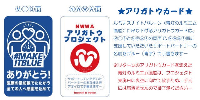 そこで、10年前の東日本大震災のとき、私が大津市ボランティア連絡協議会の会長をしていた当時、レインボーハートプロジェクト立ち上げて、新学期を向かえている福島県と岩手県の子どもたちに手づくりの給食袋を直接手元に届けに行く活動をしていたこともあり、コロナ禍で人同士の繋がりが疎遠になっているなか、私の周りのイロイロな方から『コロナ渦のなか医療従事者の人たちに感謝とエールを届けたい!』という想いをたくさん聞き、何か役に立てることができないかと考えていると、MAKE IT BLUE JAPAN実行委員会さんのことを知り、『青』で感謝の気持ちを医療の最前線でたたかう全ての人へ #MAKEITBLUEという活動に賛同し、私はアクアティックディレクターとしてブルーを基調とする水辺でのイベント等の企画を本業にする傍らプロボノ活動の一環として、NWWAアリガトウプロジェクトを立ち上げ試行錯誤するなか、マテリアル風船・遊さんの協力で本来のルミエム風船は蛍光蓄光発色となるが、特別にブルー蓄光発色を製造してもらえることとなり、今回のルミナスナイトバルーン(青灯のルミエム風船)にブルーでサポートパートナーの名前を手書きしたアリガトウカードを吊り下げて夜空に向けて放すことで、 みなさんの想いを世界中の医療従事者の人たちに届けるための一つの形にすることができましたので、みんなが一丸となってこの状況を乗り越える一助となることを願い、クラウドファンディング『CAMPFIRE』にてサポートパートナーを集うことにいたしました。