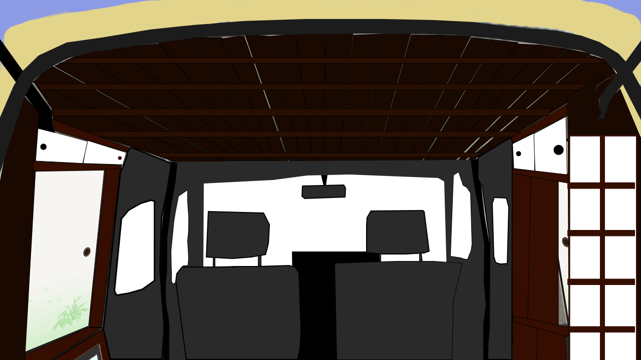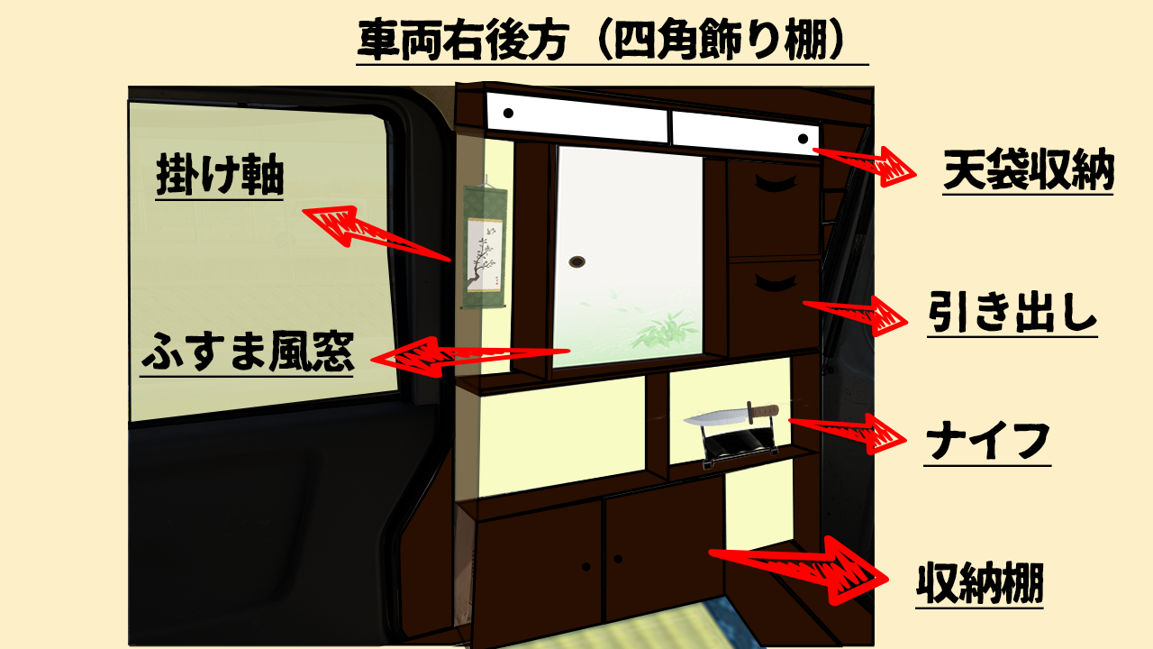 また車両左側にはPC作業などができるデスクを作り、小窓部分には小さなふすまを取り付け、開け閉め可能で景色を楽しめるようにもします。