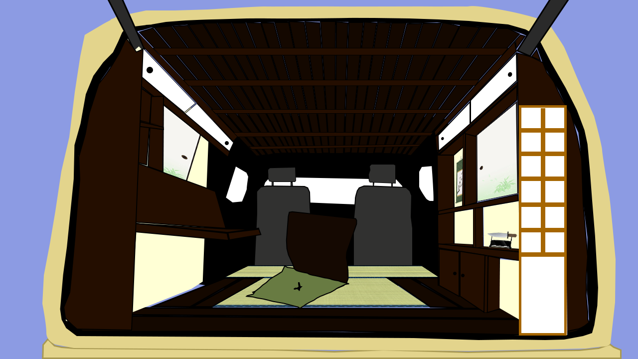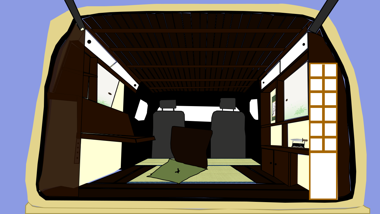 軽バンの床に畳を張り、天井は木張りで”ザ・日本の和室”のようなモダンで落ち着いた雰囲気に仕上げます。車両右側には四角飾り棚を一から作り取り付けます。